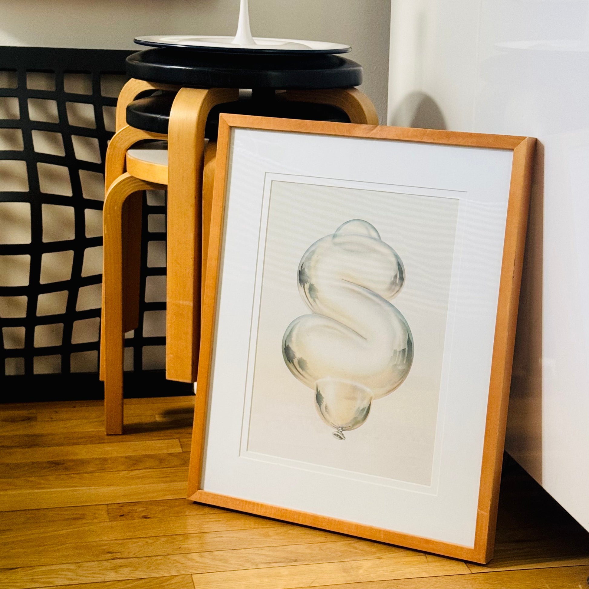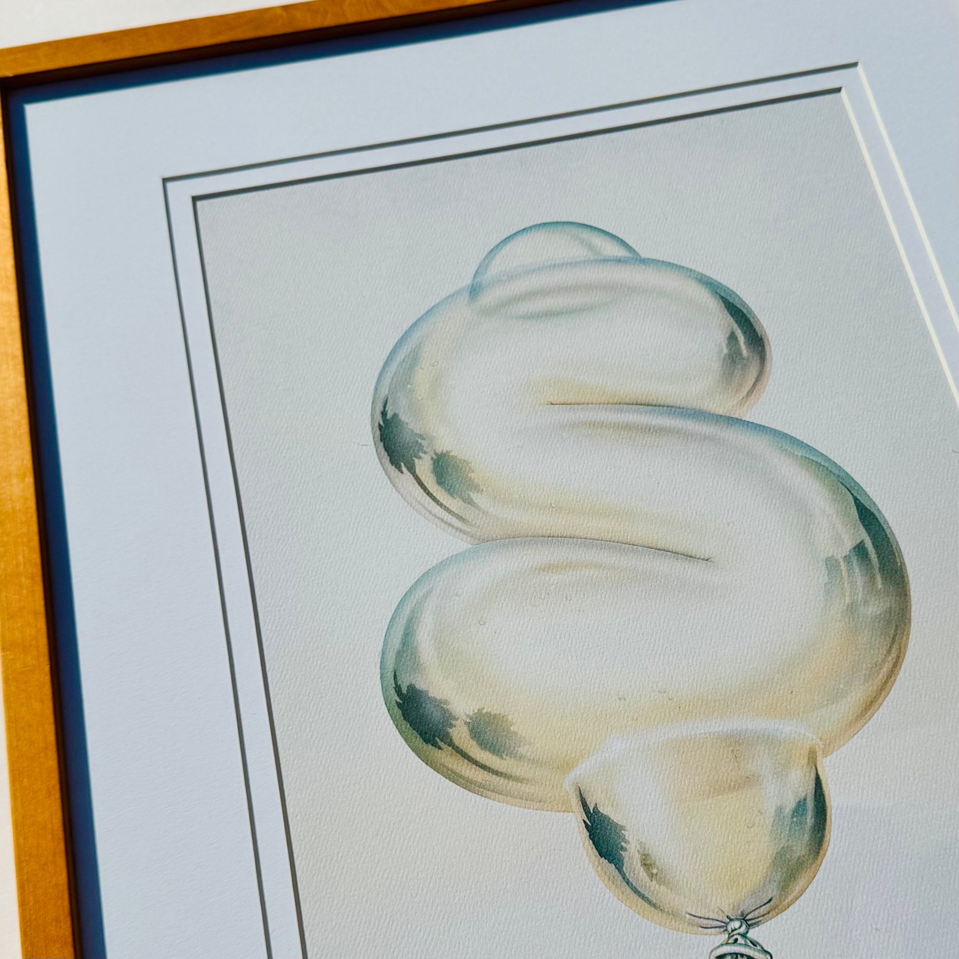 Features floating airbrush ballon / bubble / condom illustration with reflections of LA palms by the legendary airbrush artist Charles White III. Double matted behind glass in birch wood frame. Print has minor crease with minor scratches to glass and minor wear to frame. Wired to hang.