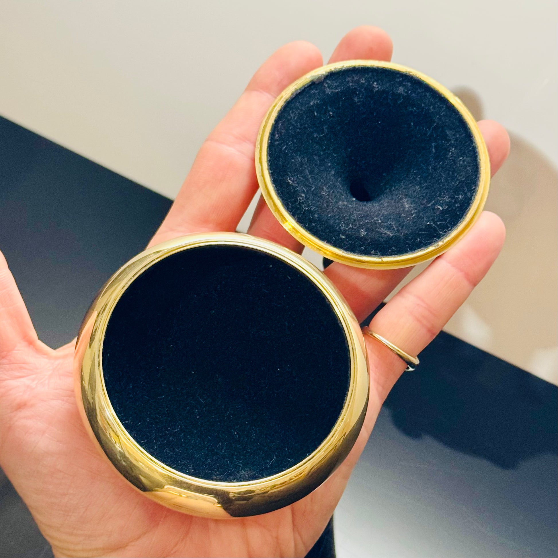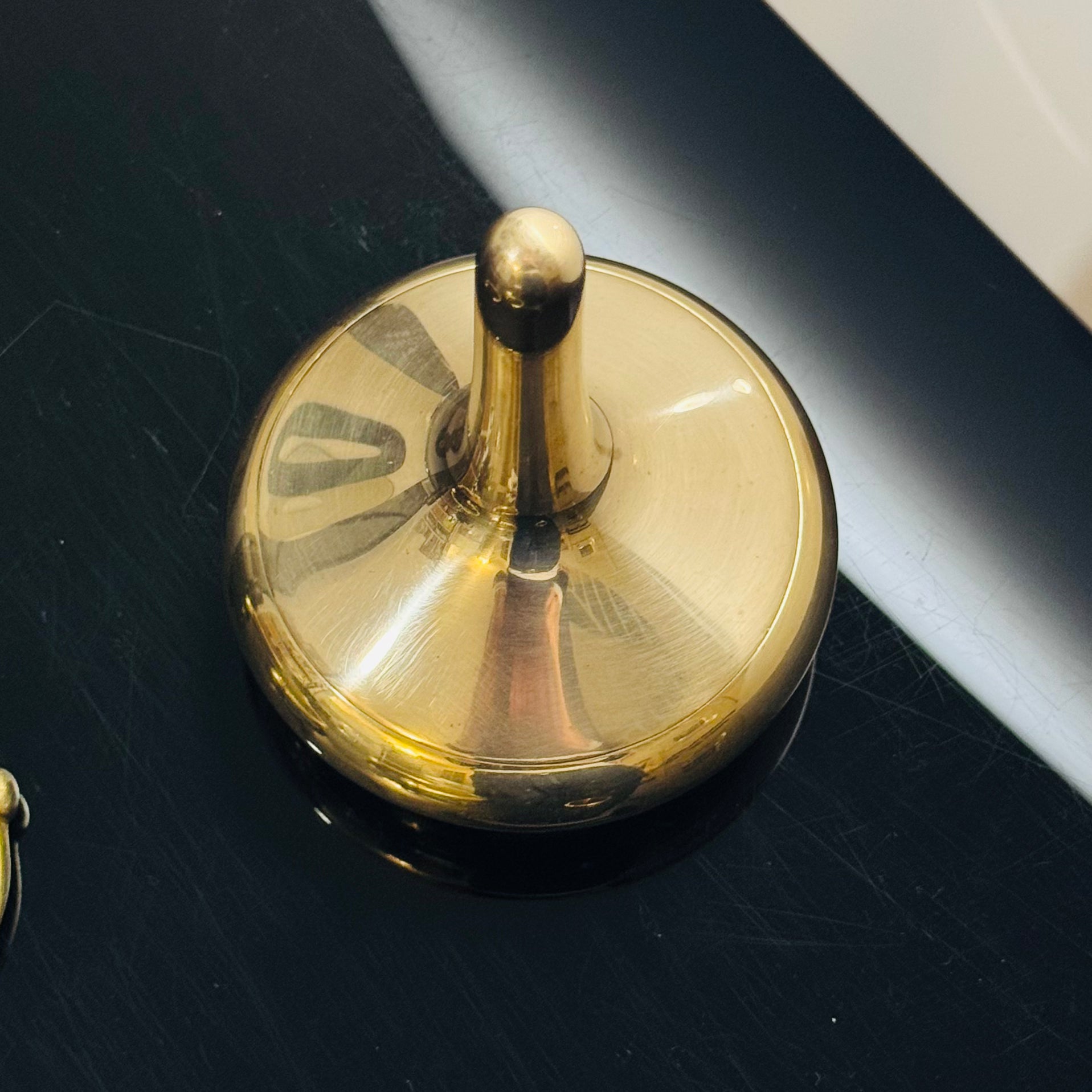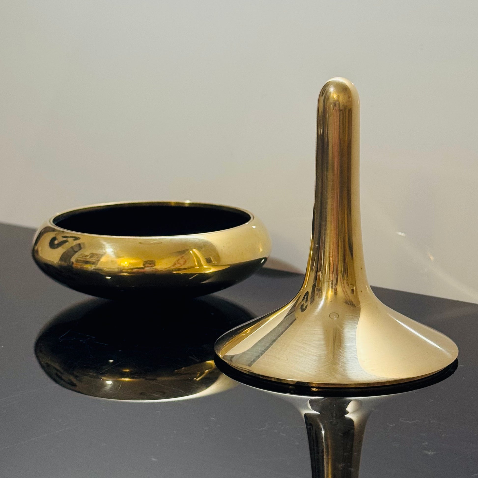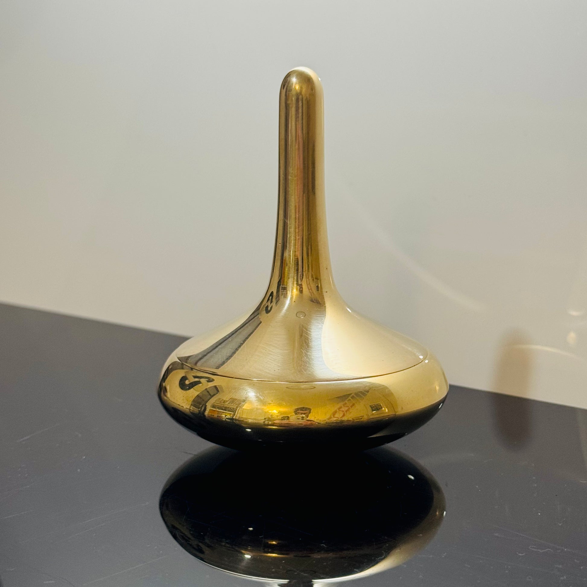 A jewellery box for the bedside table in sculptural mirror polished brass. Lift the lid with the handle and there is a velvet-lined compartment inside the base. Slot rings over the handle and keep necklaces and bracelets inside. Close the lid, nudge the handle gently sideways and watch the box wobble from side to side. Minor age appropriate wear / tarnish. Shows very well and is exceptionally well made and hard to come by.