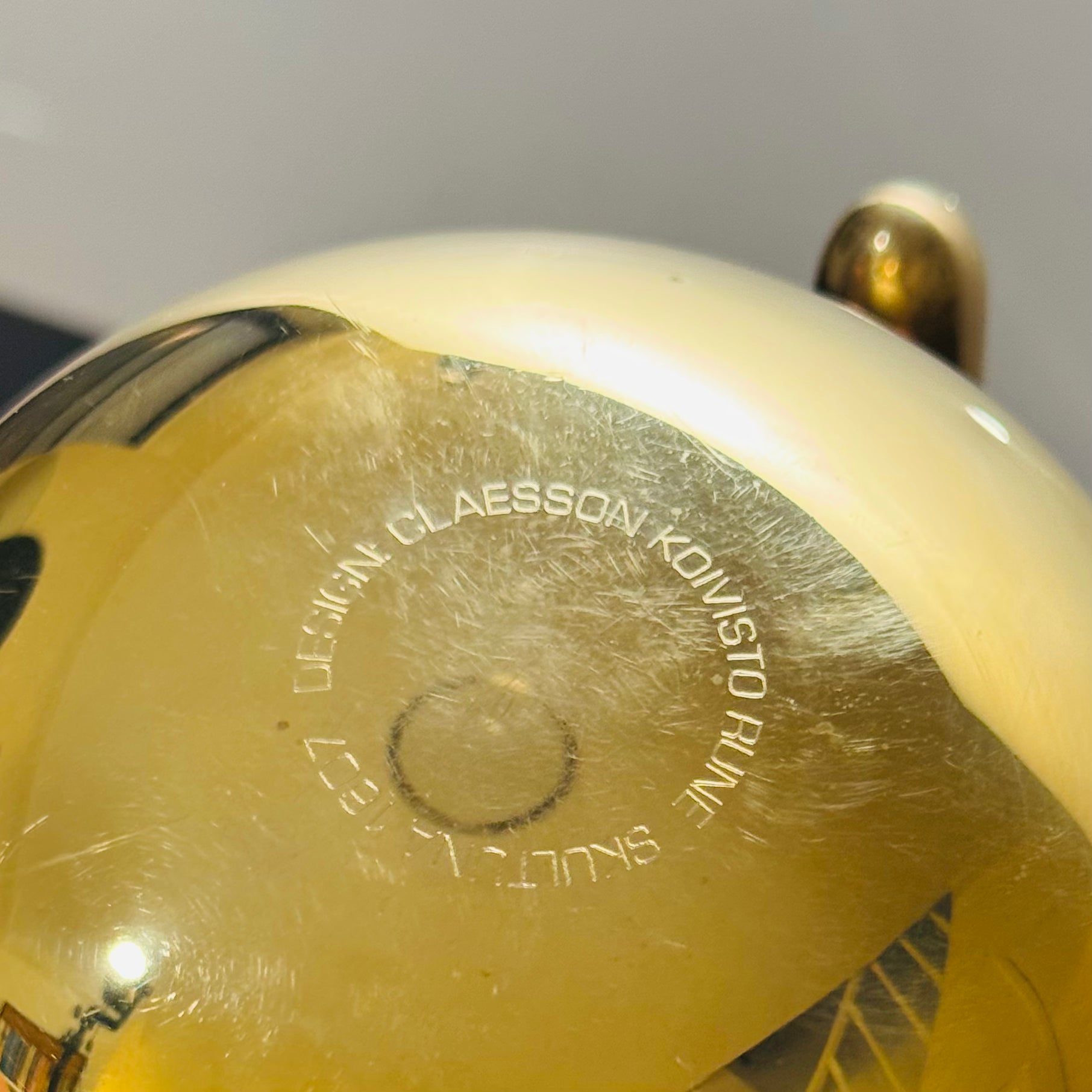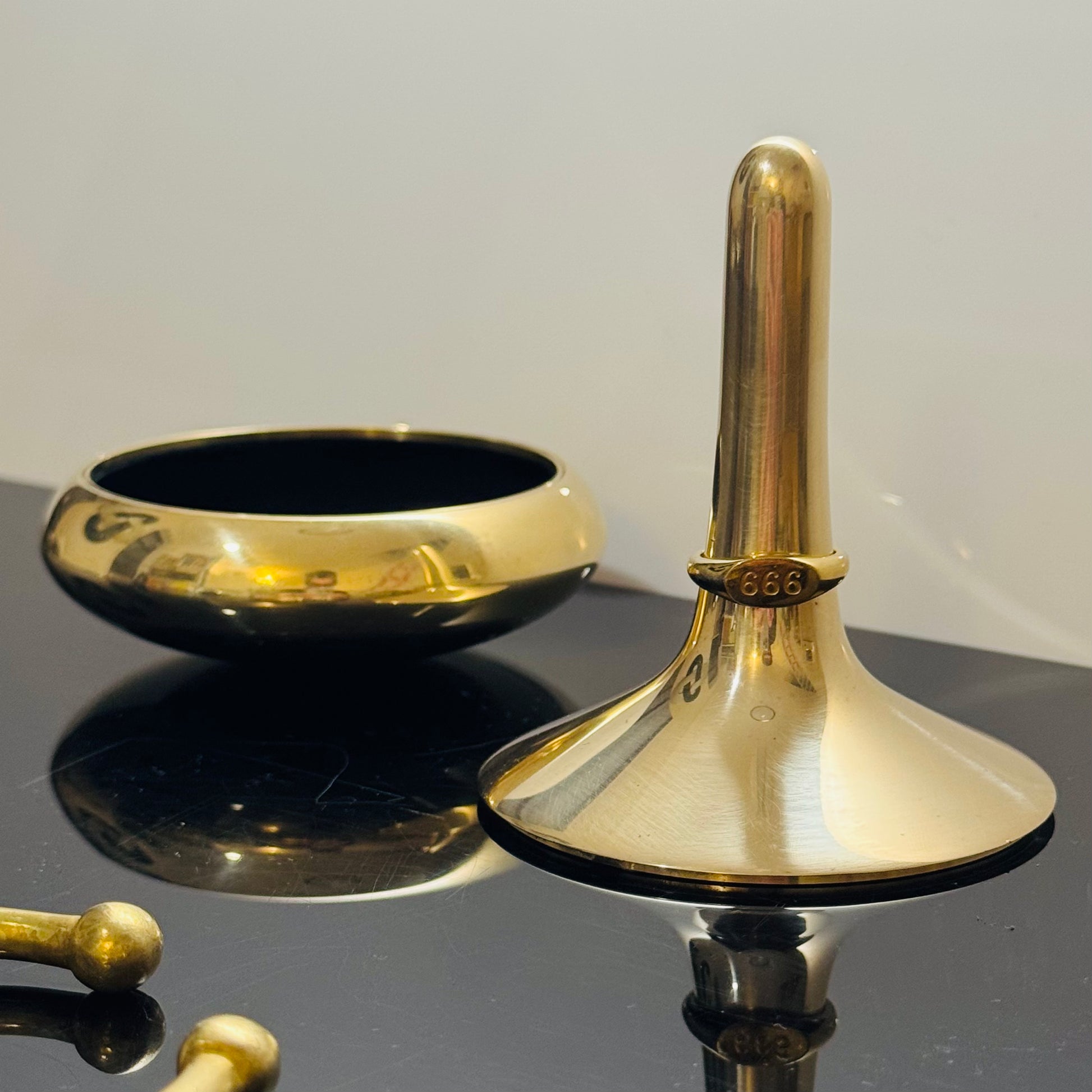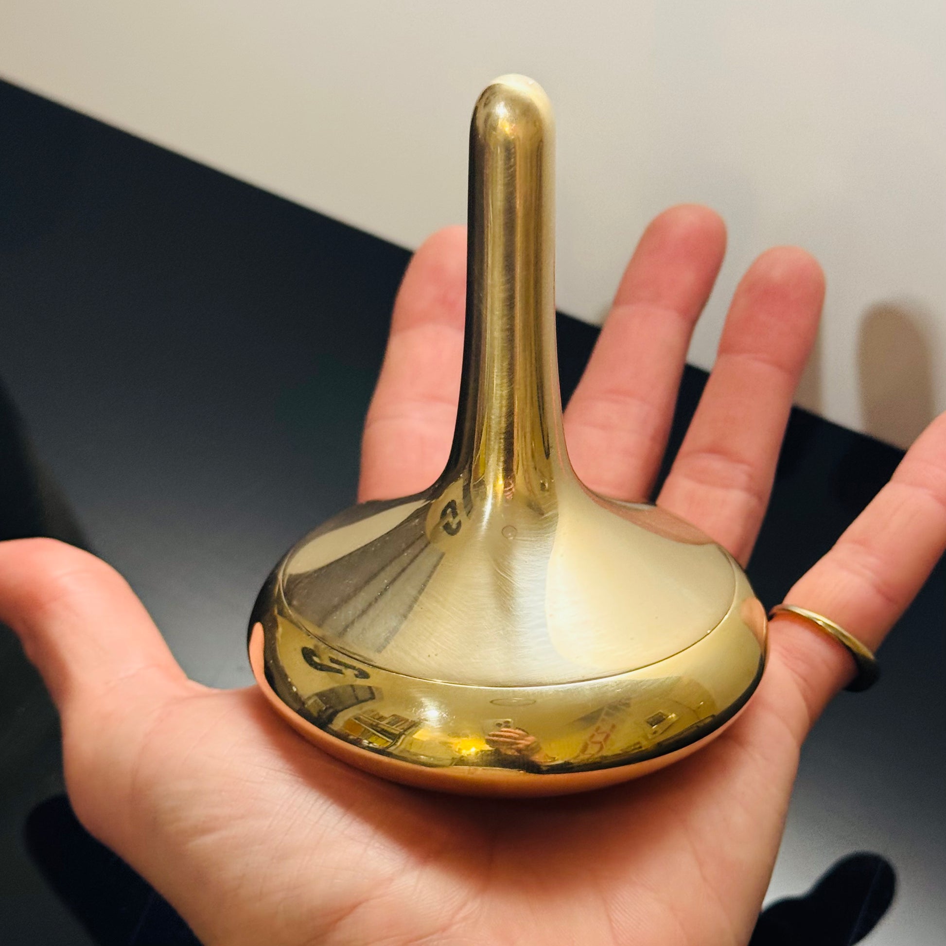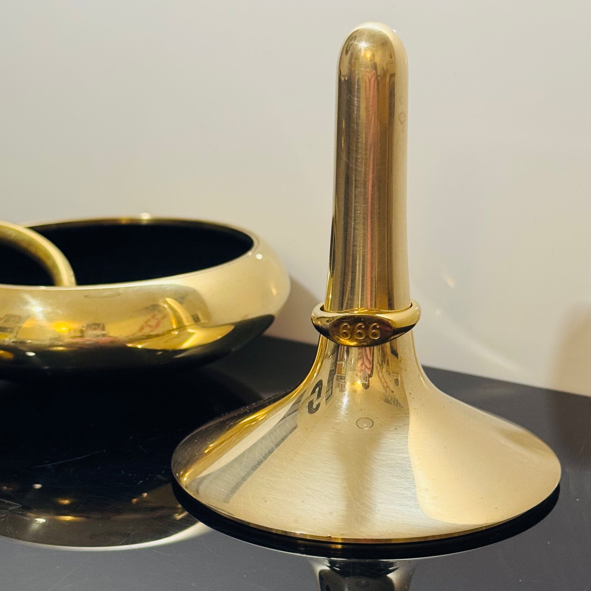 A jewellery box for the bedside table in sculptural mirror polished brass. Lift the lid with the handle and there is a velvet-lined compartment inside the base. Slot rings over the handle and keep necklaces and bracelets inside. Close the lid, nudge the handle gently sideways and watch the box wobble from side to side. Minor age appropriate wear / tarnish. Shows very well and is exceptionally well made and hard to come by.