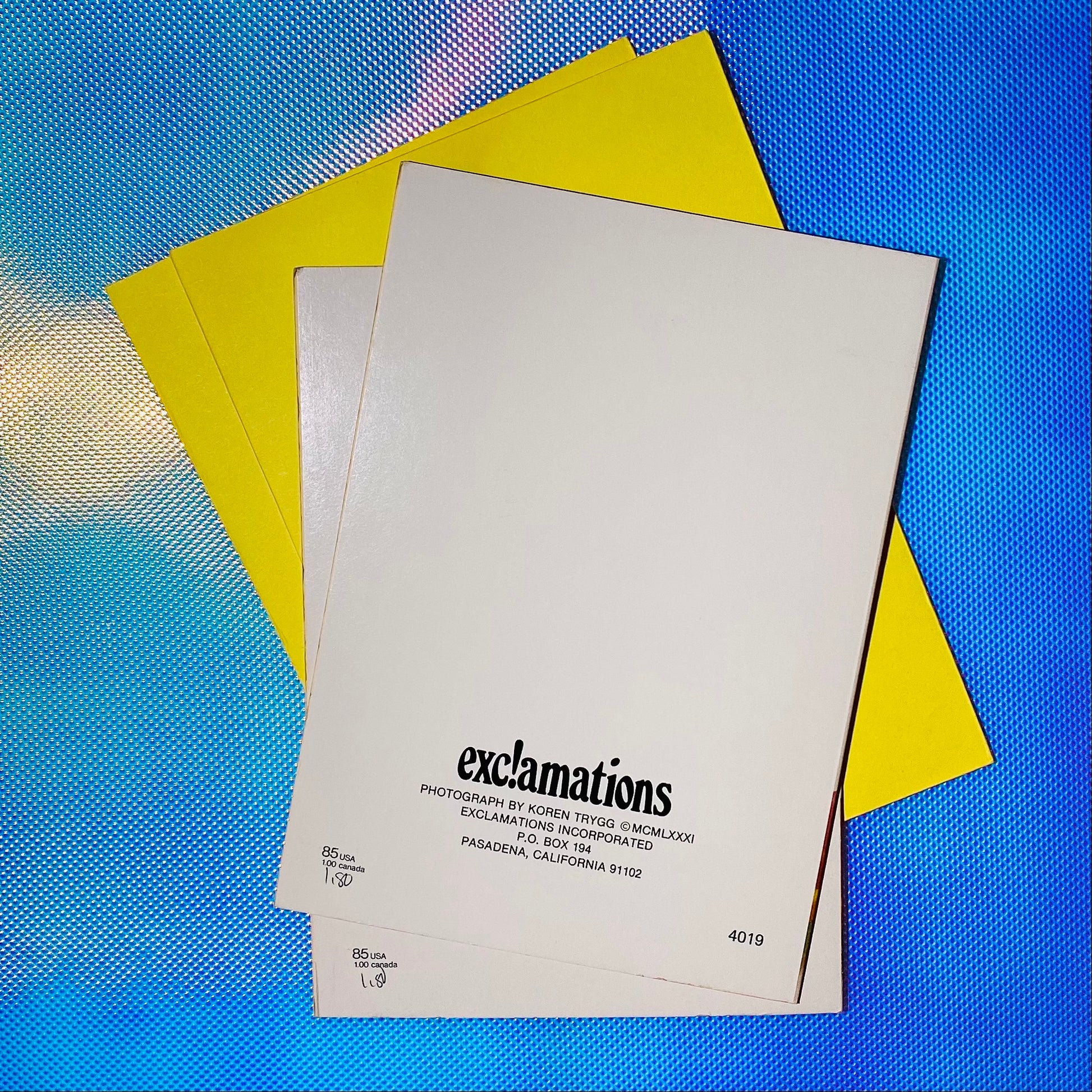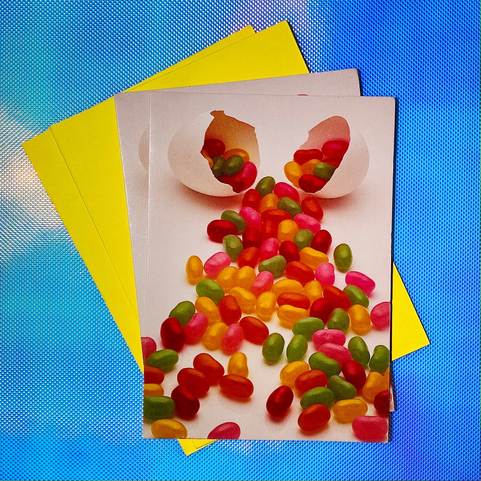 Deadstock 'Spilled the Beans' cards by Koren Trygg for Exc!amations 1980s. Set of 2 w/envelopes.