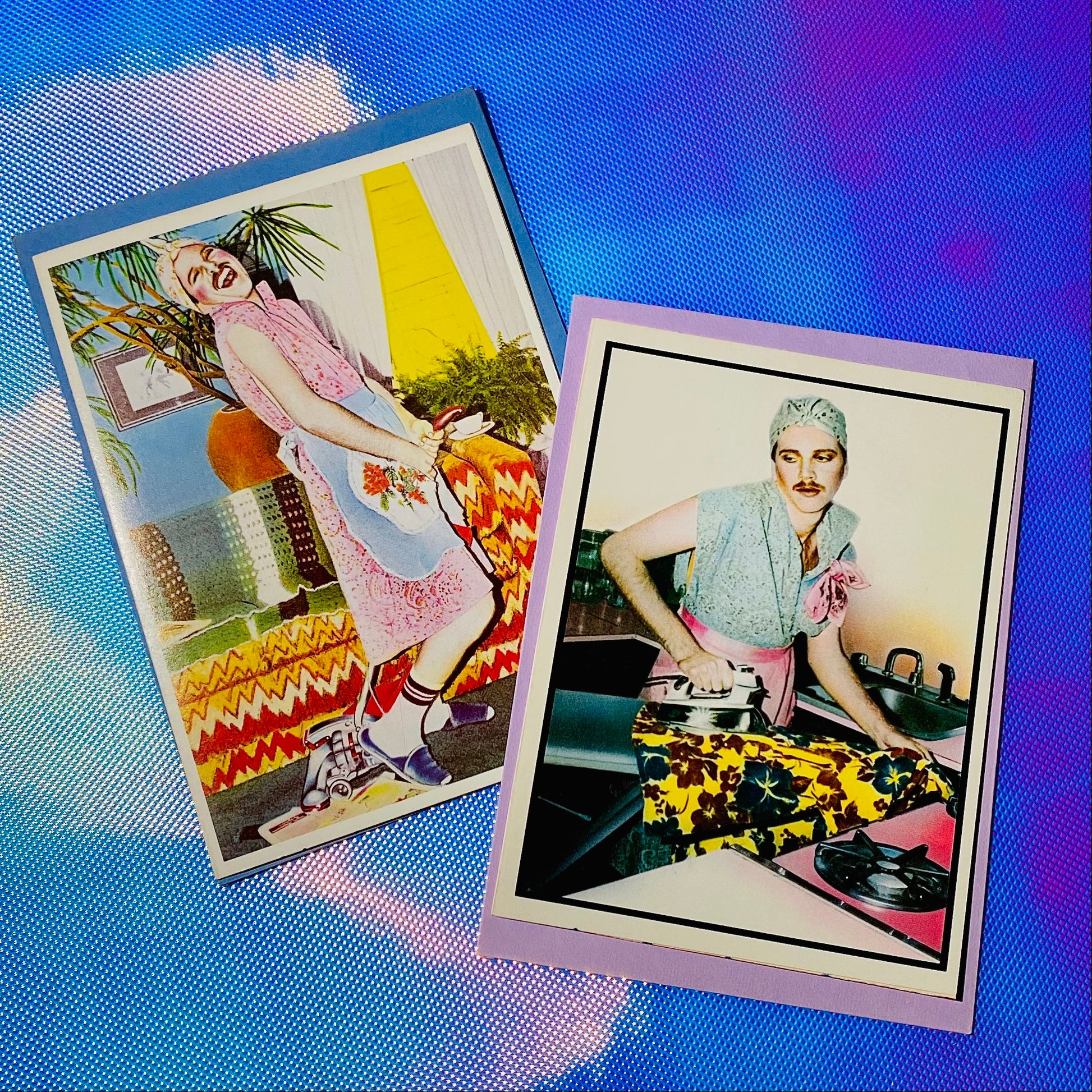 Deadstock 'A Woman's Work Is Never Done' hand tinted photo blank cards by gay graphic design company Kyle Studios circa 1979. Set of 2 w/envelopes. 3 sets available.