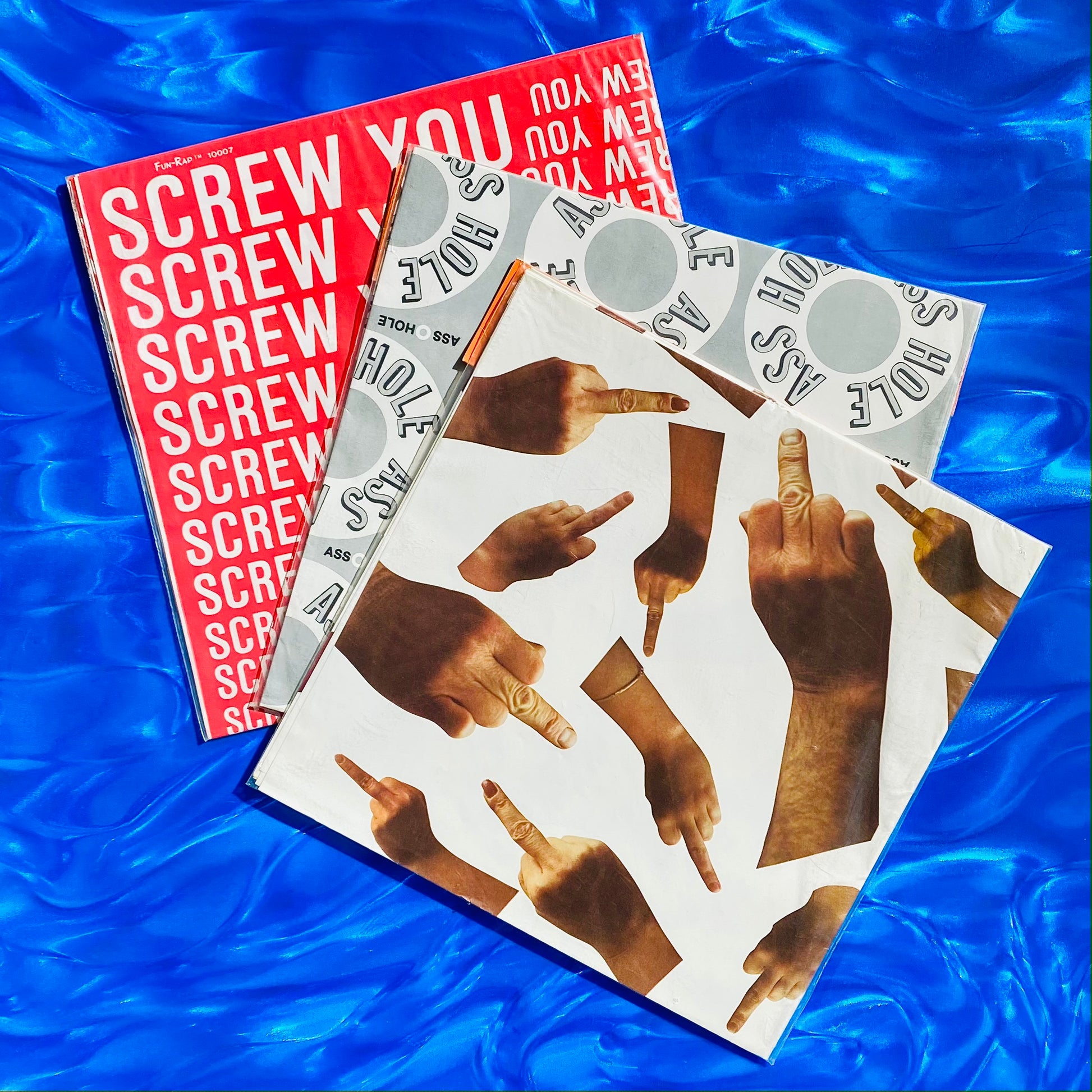 Features mega graphic SCREW YOU, ASSHOLE and MIDDLE FINGER graphics. Shows minor shelf wear consistent with age otherwise in excellent unused condition. Sold individually. Multiples available of SCREW YOU and ASSHOLE.