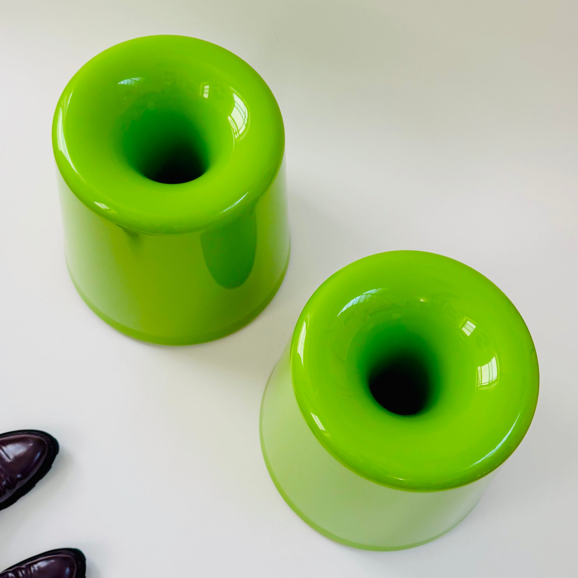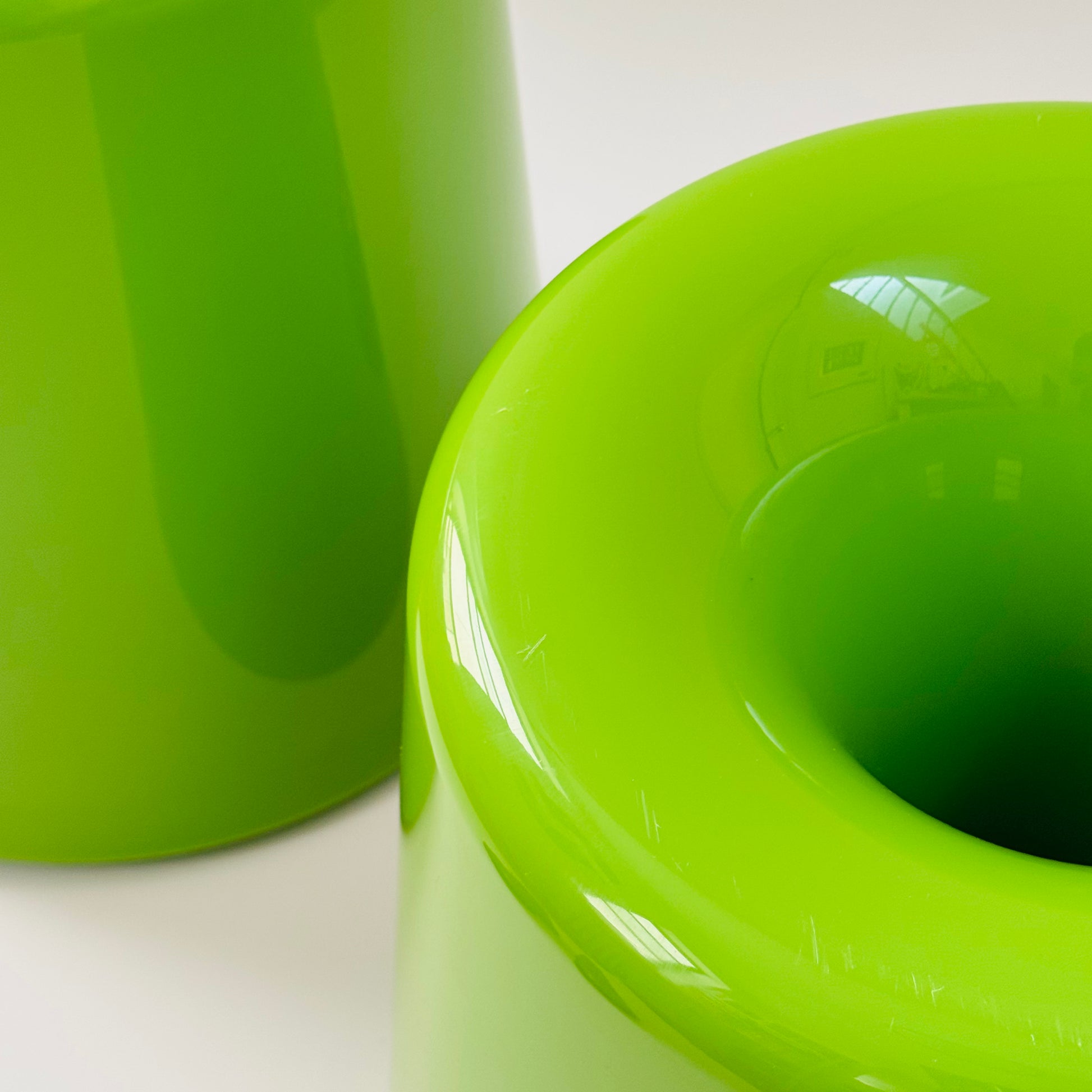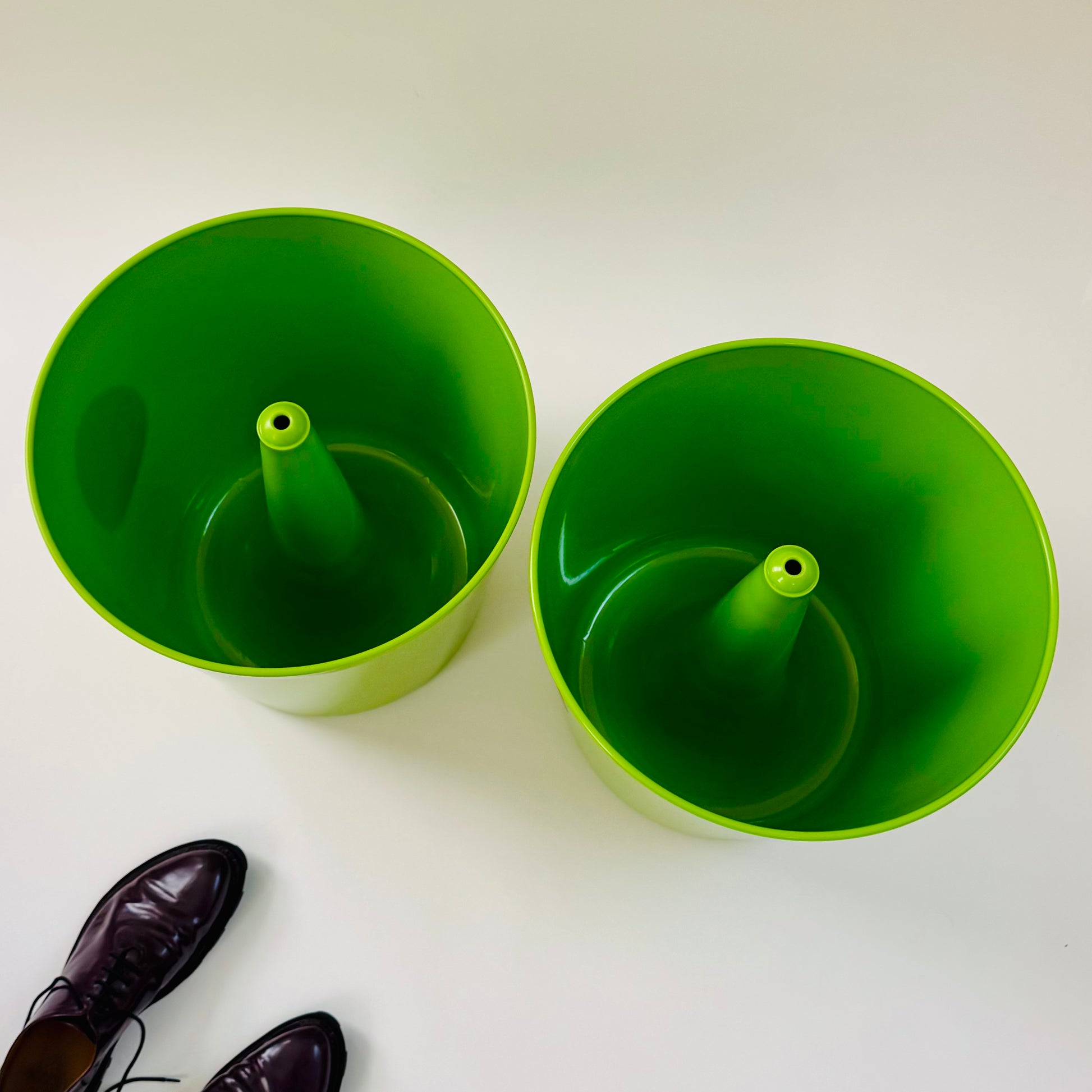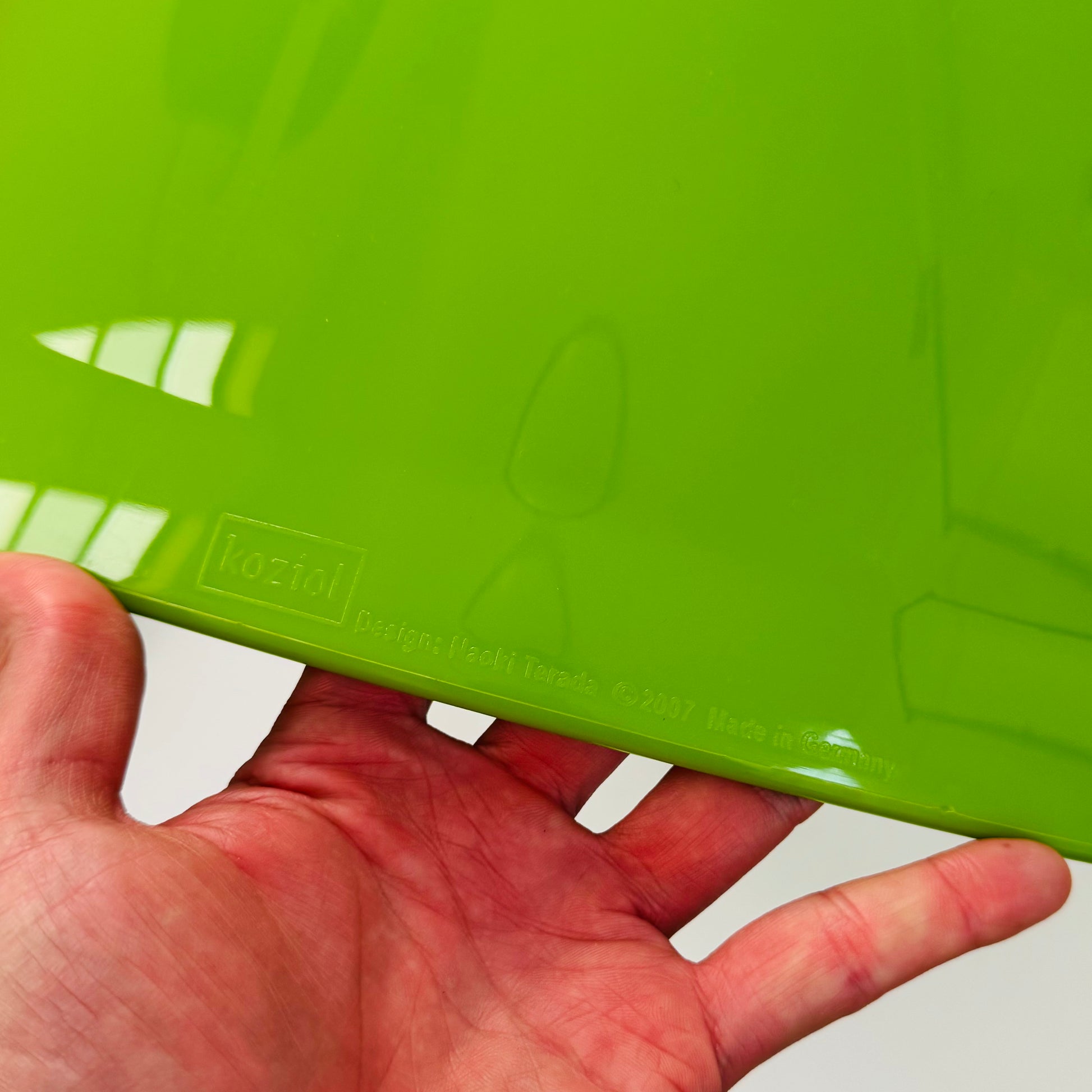 Designed by architect Terada the chair promotes dynamic sitting as it never stands stills. The stool tilts in all directions and spins 360 degrees, stimulating muscles, blood circulation and the nervous system in the process. In short it's fun to sit on. In acid / lime green resin its suitable for indoor / outdoor use. Can be used as a stool or flipped over and used for storage (umbrellas, ice bucket etc). Has minor age appropriate wear, a few scuffs as pictured with original labels and paper work. A scarce find outside of Europe. Sold individually.