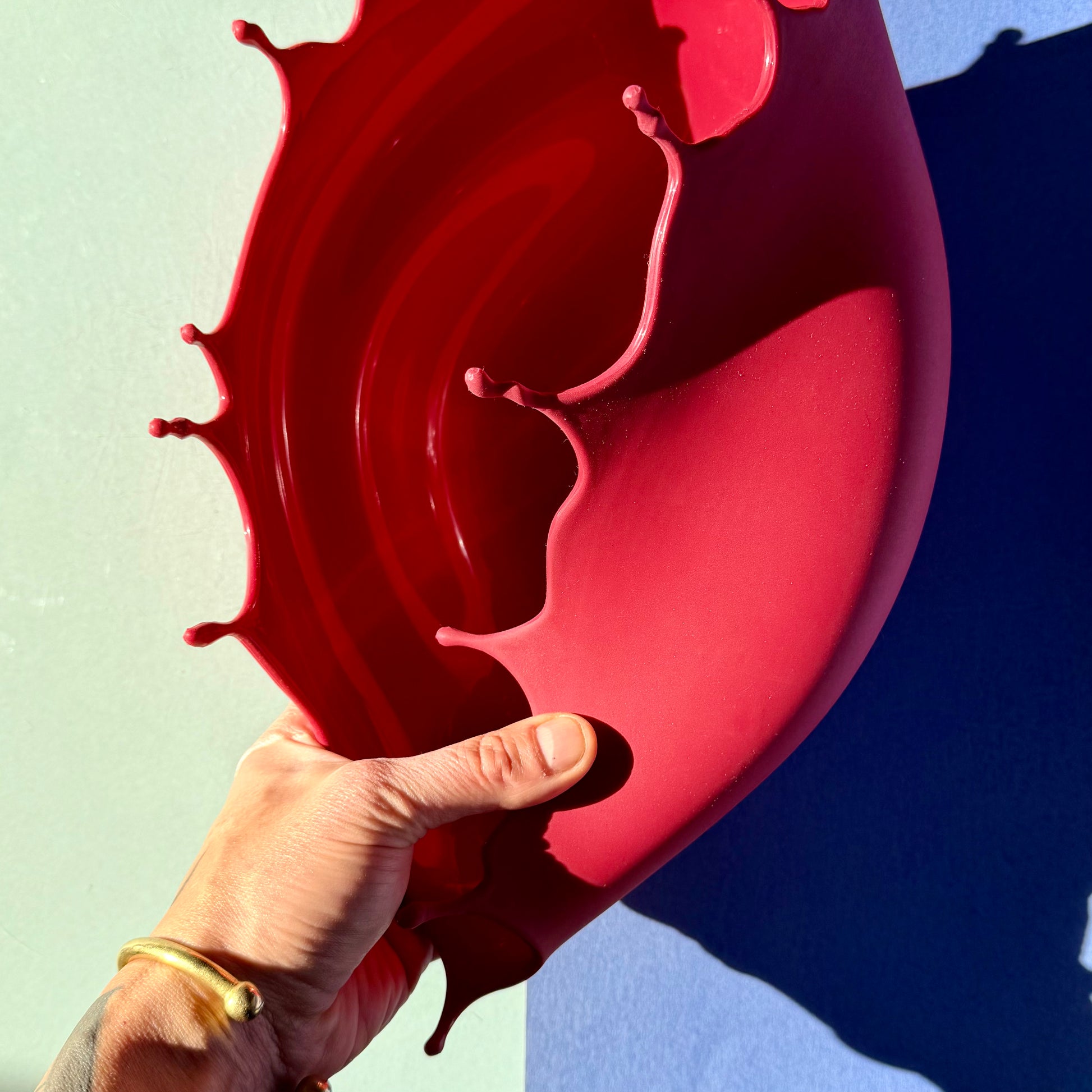 A pink silicone bowl designed to look like the splash created by a drop of paint when it lands on a surface. The inner surface is smooth and shiny while the outer is matte. Large a flexible with a variety of uses. Shows minor age appropriate wear.