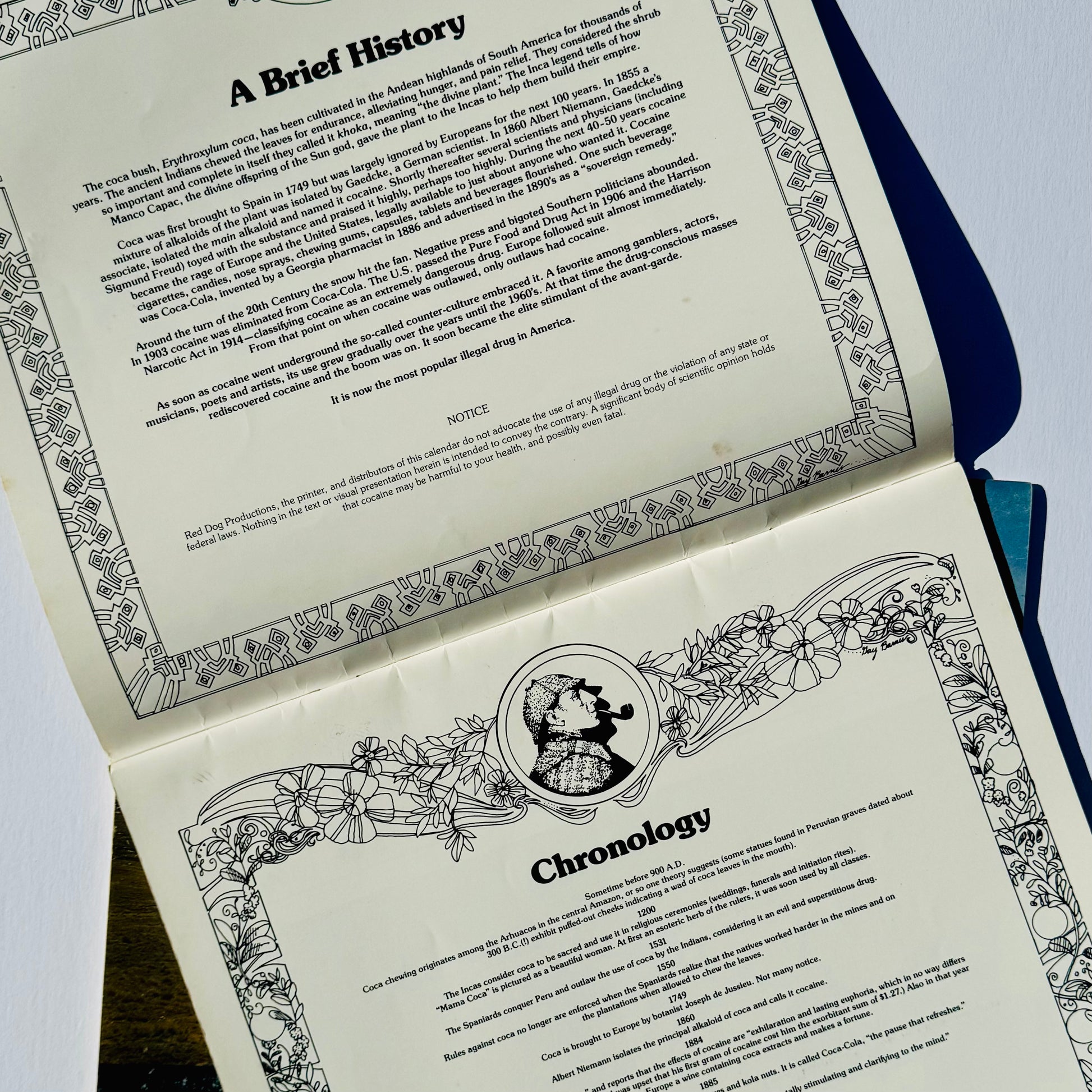 'It's the ultimate in calendars. You'll be thrilled to own and display this beautiful full color, high quality, 11" x 11" conversation piece. Printed on heavy coated glossy stock, it's a superbly photographed 12 month pictorial essay depicting the lore of coca*ne from "The Source" to "White Christmas". Includes a brief but fascinating history, chronology and quotations. It's the perfect gift item". Each month’s photo shows the coca plant at a different stage of its transition to coca*ne powder, from its source in the Andes to its destination as a Christmas gift, and of course, users enjoying it.