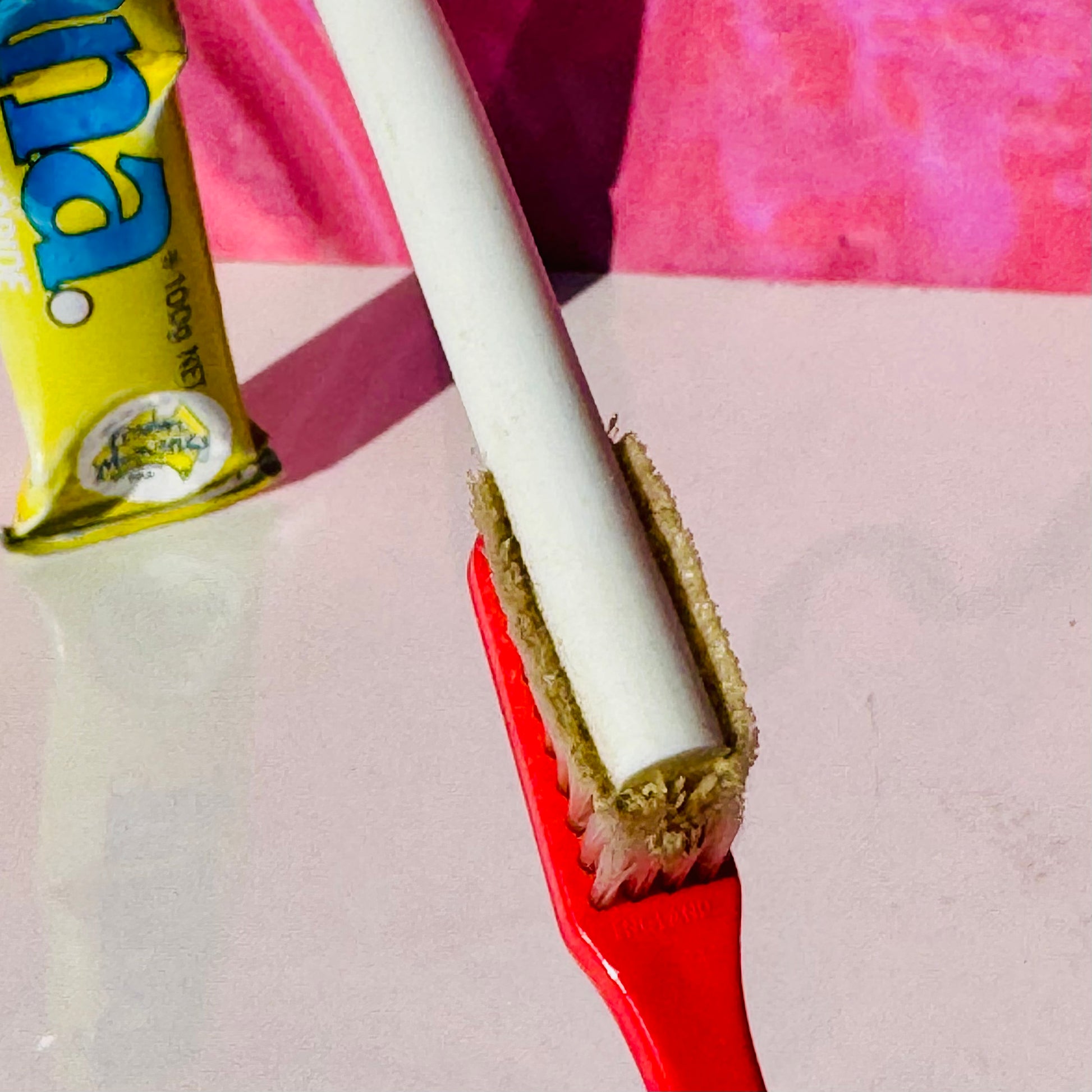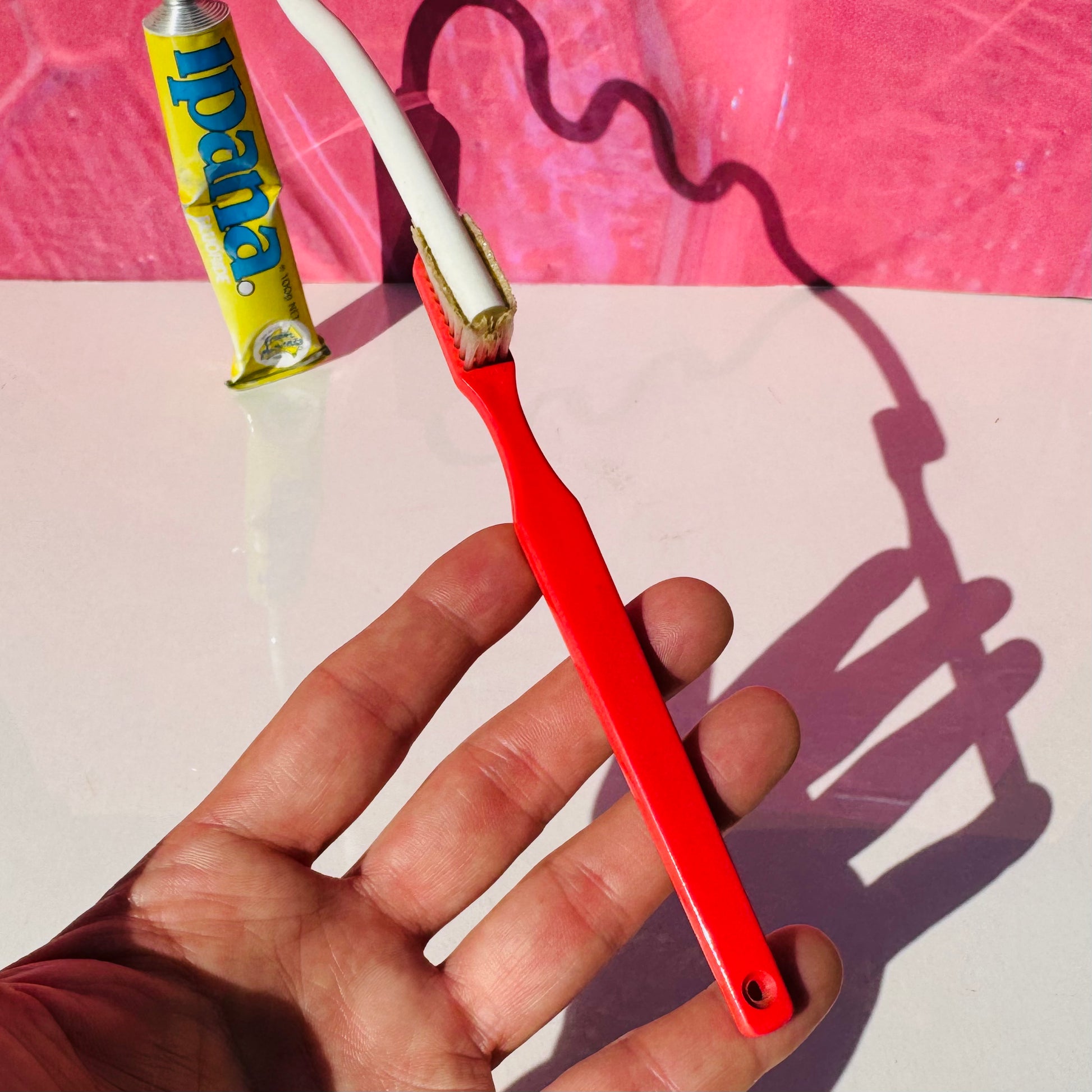 Features real tube of Ipana toothpaste in mid squeeze with sculptural white resin toothpaste in mega squiggle with real toothbrush base. Shows minor age appropriate wear with some fading to toothpaste tube. It's the holy grail of Frozen Moments and from my personal collection, almost impossible to find.