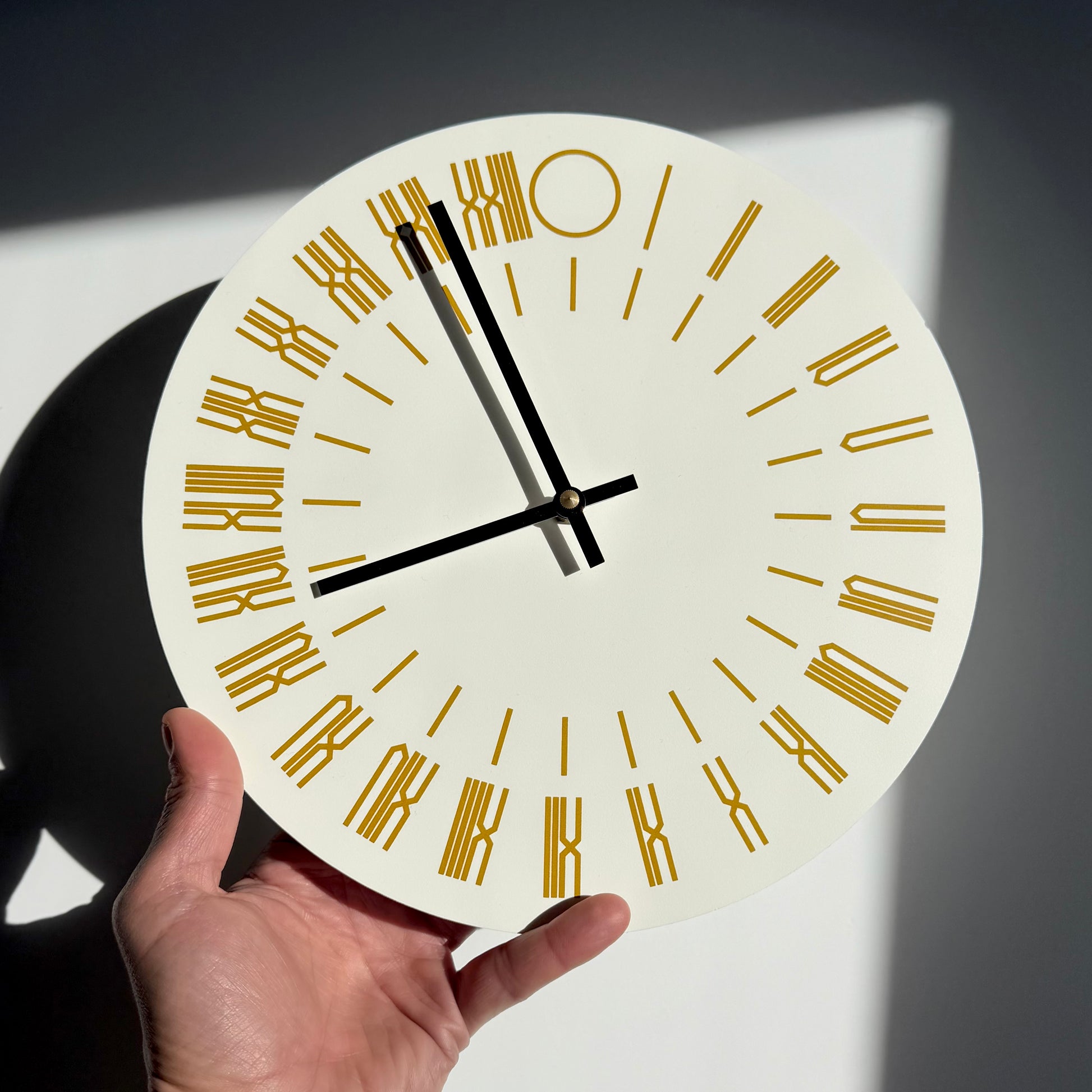 'The Clock' a limited edition 24 hour clock from Tauba Auerbach created for issue 20 of The Thing Quarterly in 2013. Known for her stunning typography and print works the clock takes on an analogue timepiece with a 24 hour version running from midnight to midnight. The clock features black hour and minutes hands and gold-hued numerals in Auerbach’s signature graphic style. The clock can be hung with the built-in hook and needs just one AA battery to get up and running. In excellent condition working condition showing minor age appropriate wear. At auction and elsewhere goes for $$$. Does not include original box.