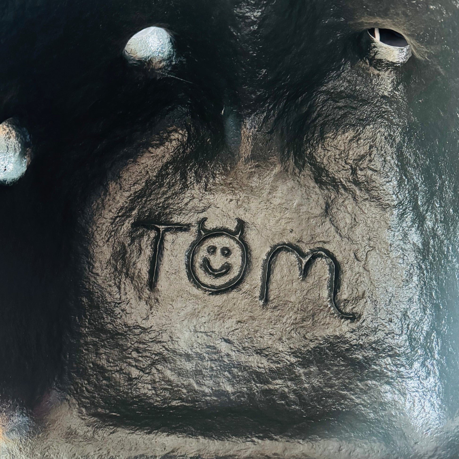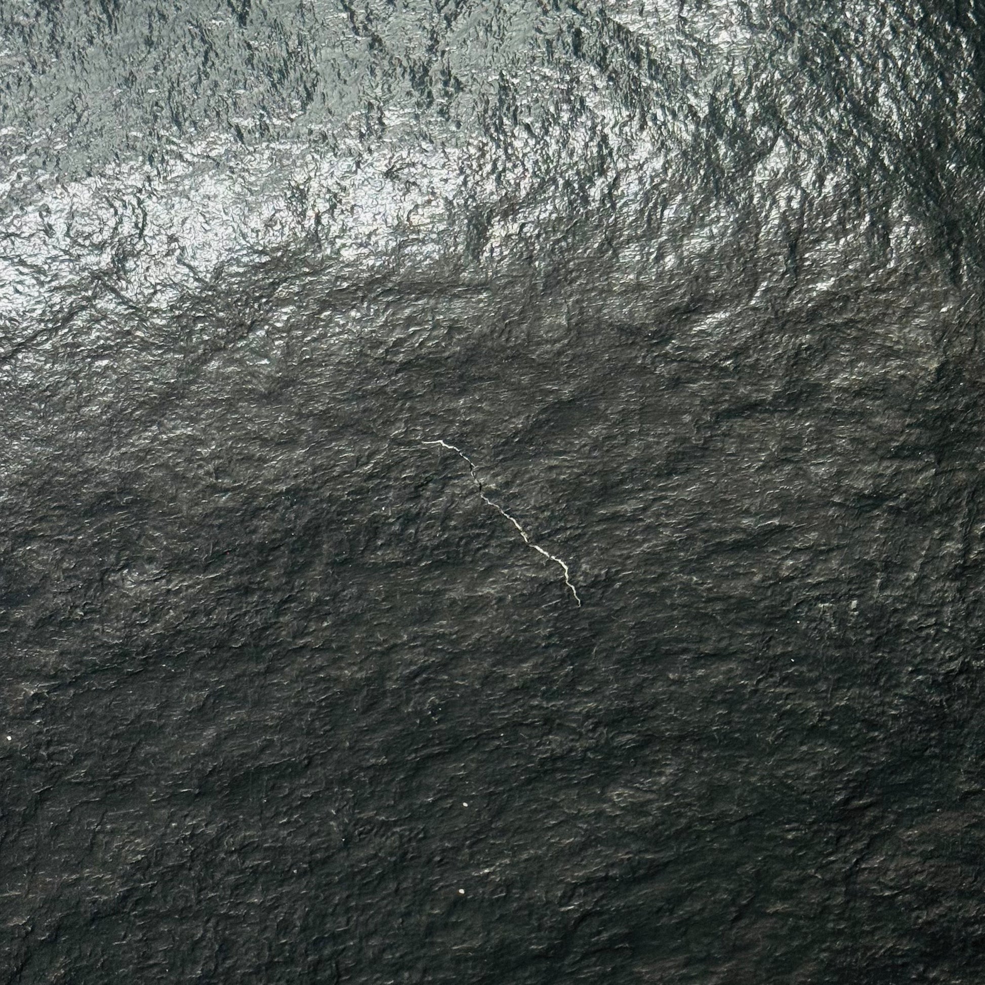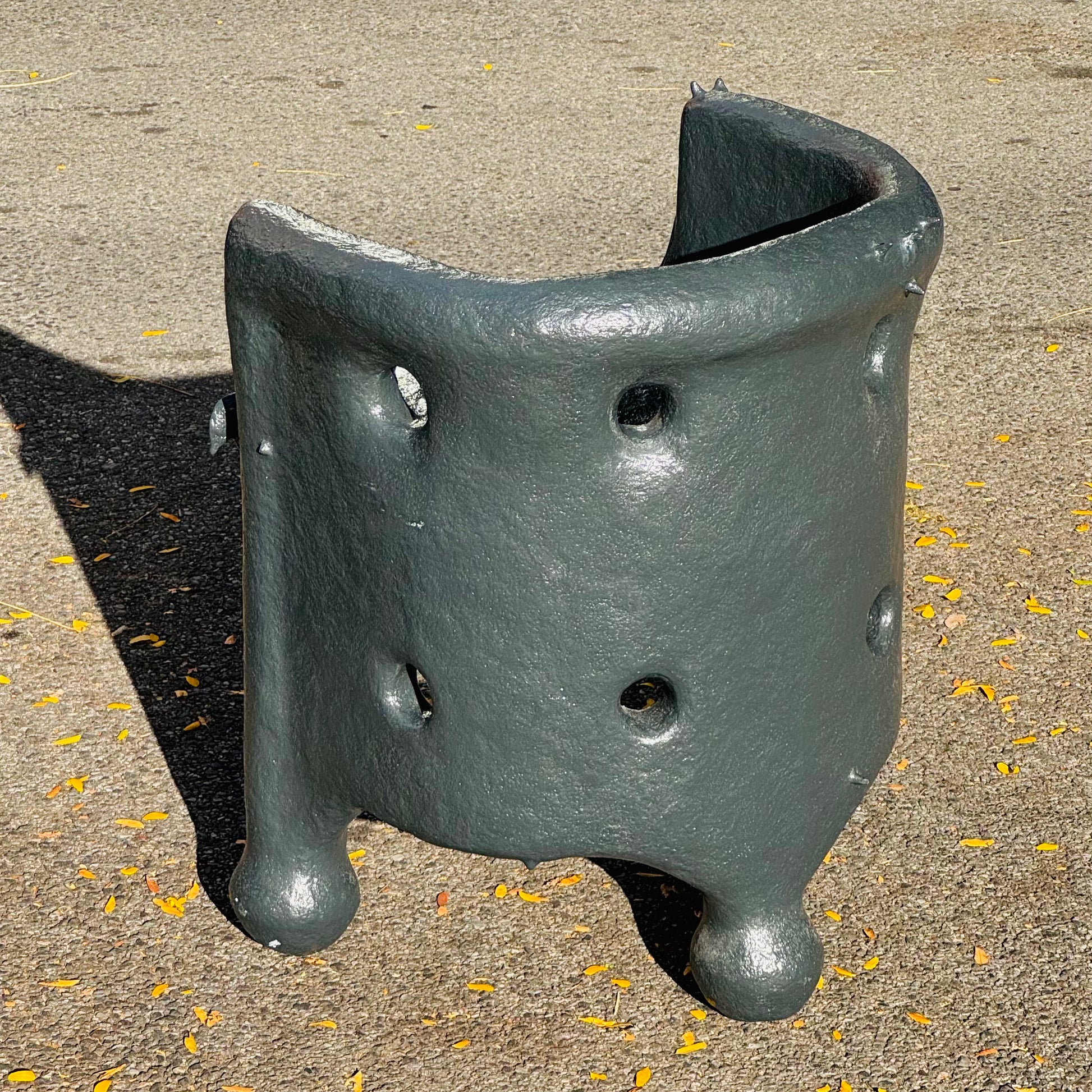 Features paper pulp on found form built up in sculptural form with polyurethane / resin coating and dark grey pigment. Rounded seat back with multiple holes and chunky legs with round feet. Has spikey detail and organic folding feature at seat uncommon on most of his work. Shows minor age appropriate wear, scuffs, paint loss and small partition on seat. Signed on base. Shows excellently and is substantial in form. Gallery level shit.