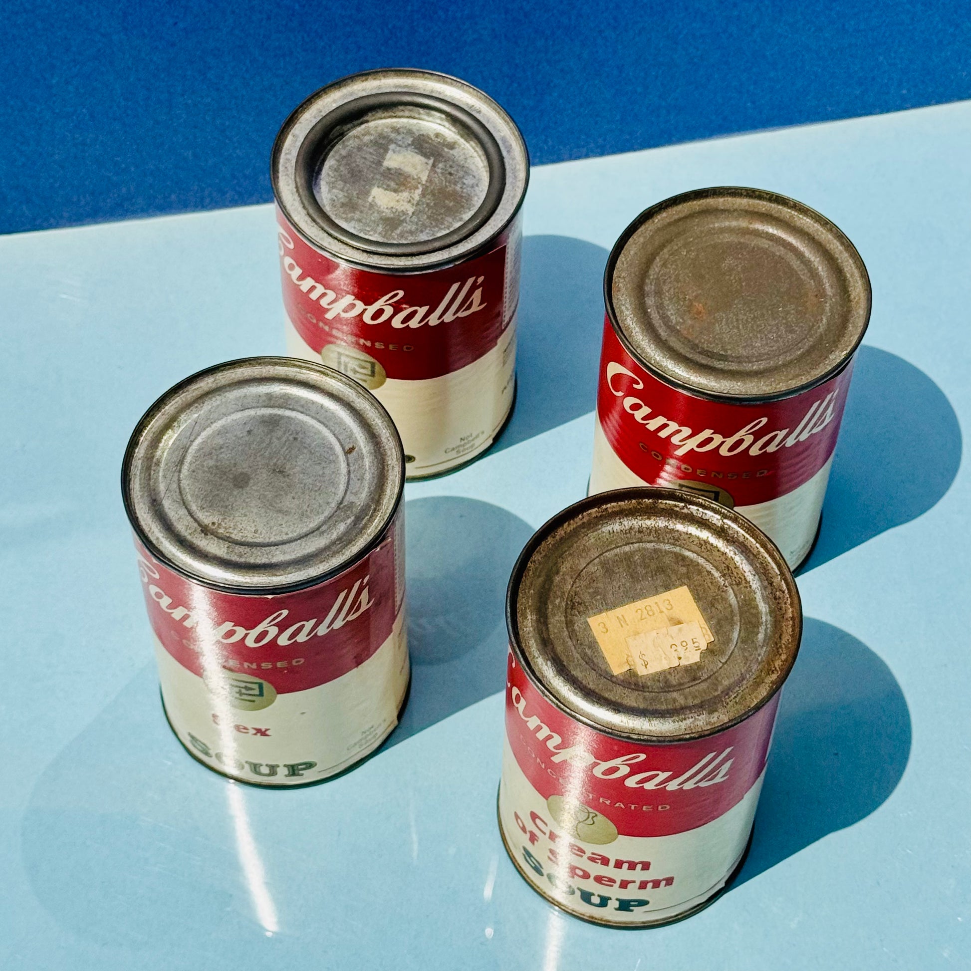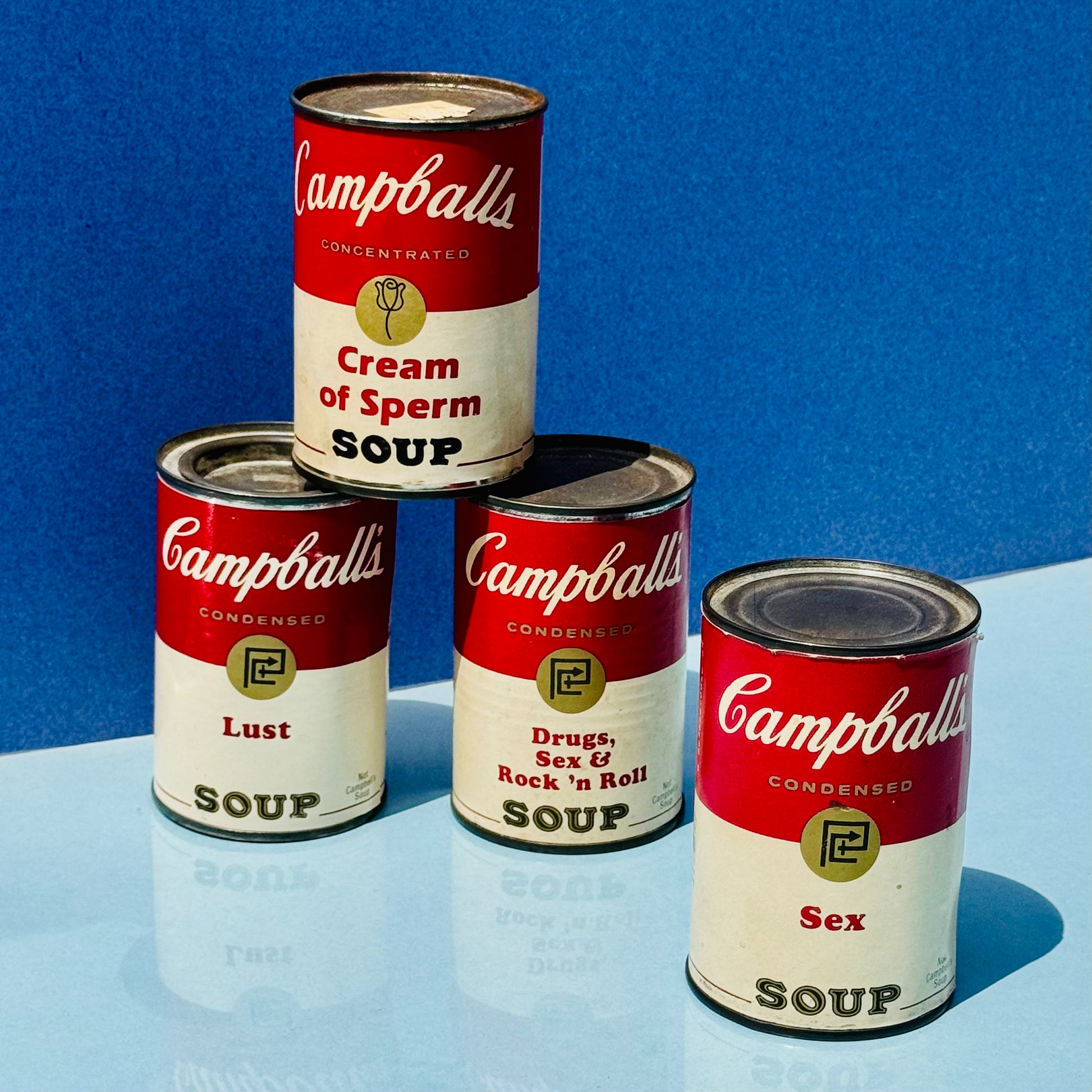 Features real soup cans with alternate labels made famous during the Warhol era of pop art. He was known to sign these when presented. Four available flavors: Sex, Lust, Cream of Sp*rm, Drugs Sex & Rock 'n Roll. Insane detail on the recipes and usage. The Lust can is a stash box while the others have soup in them but strangely not completely filled even tho they are sealed. Where'd it go? Shows age appropriate wear as pictured.These are the real deal and very hard to find, from my personal collection. Priced Individually.