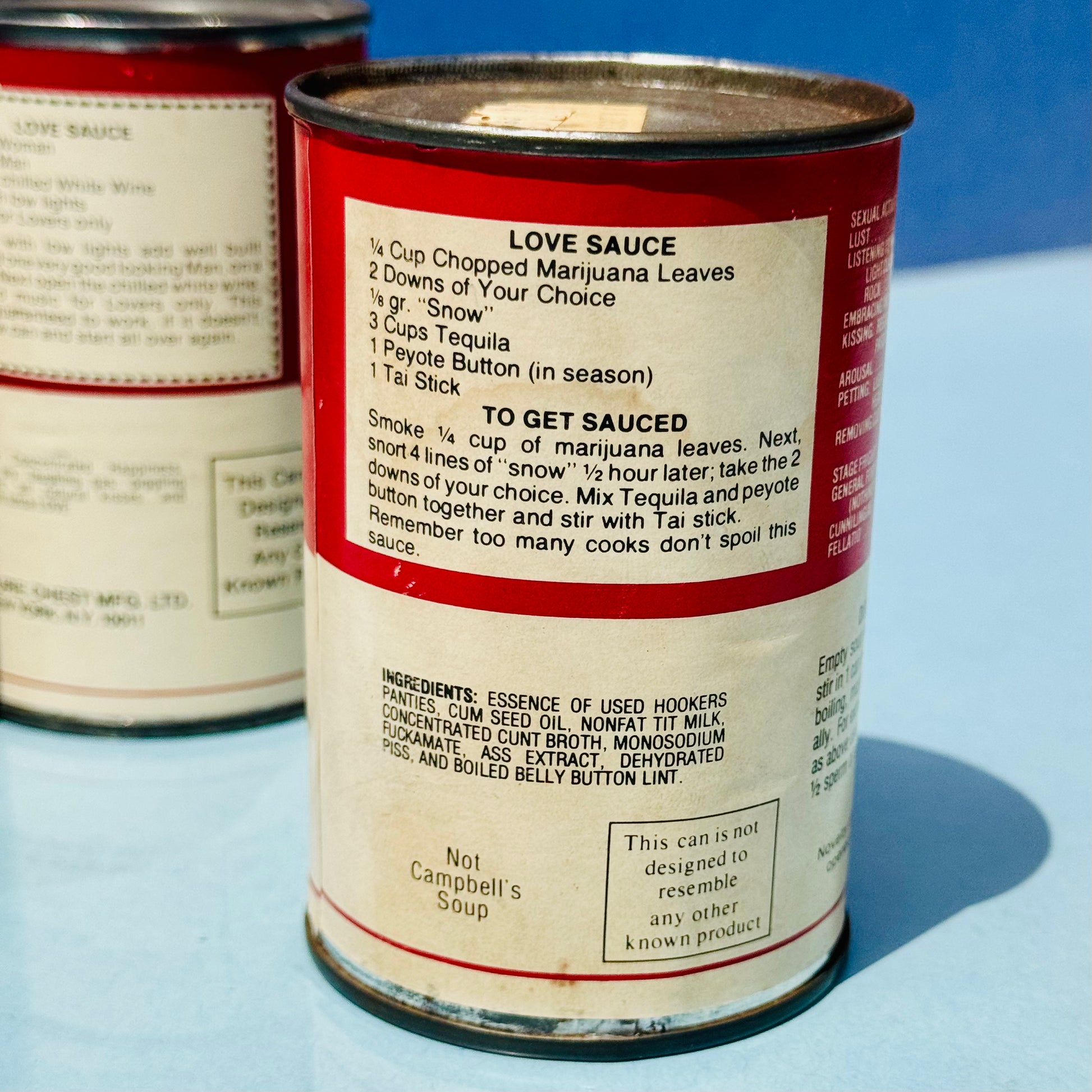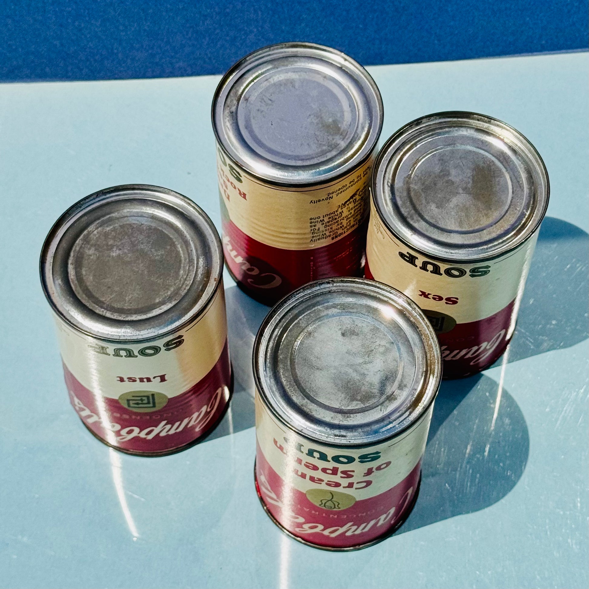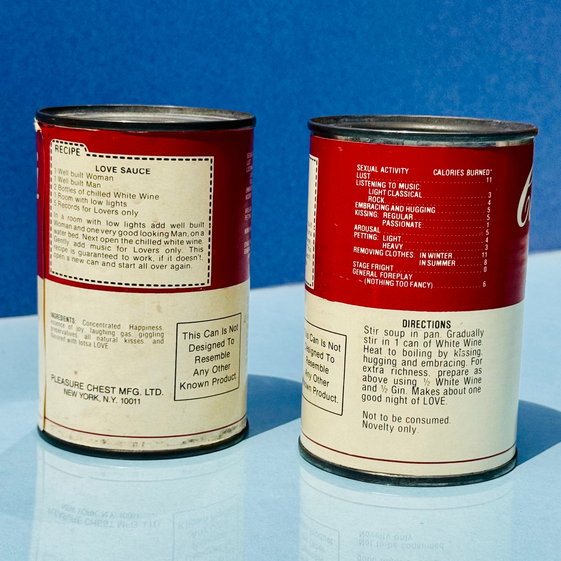 Vintage Camball's naughty novelty soup cans circa 1970s.
