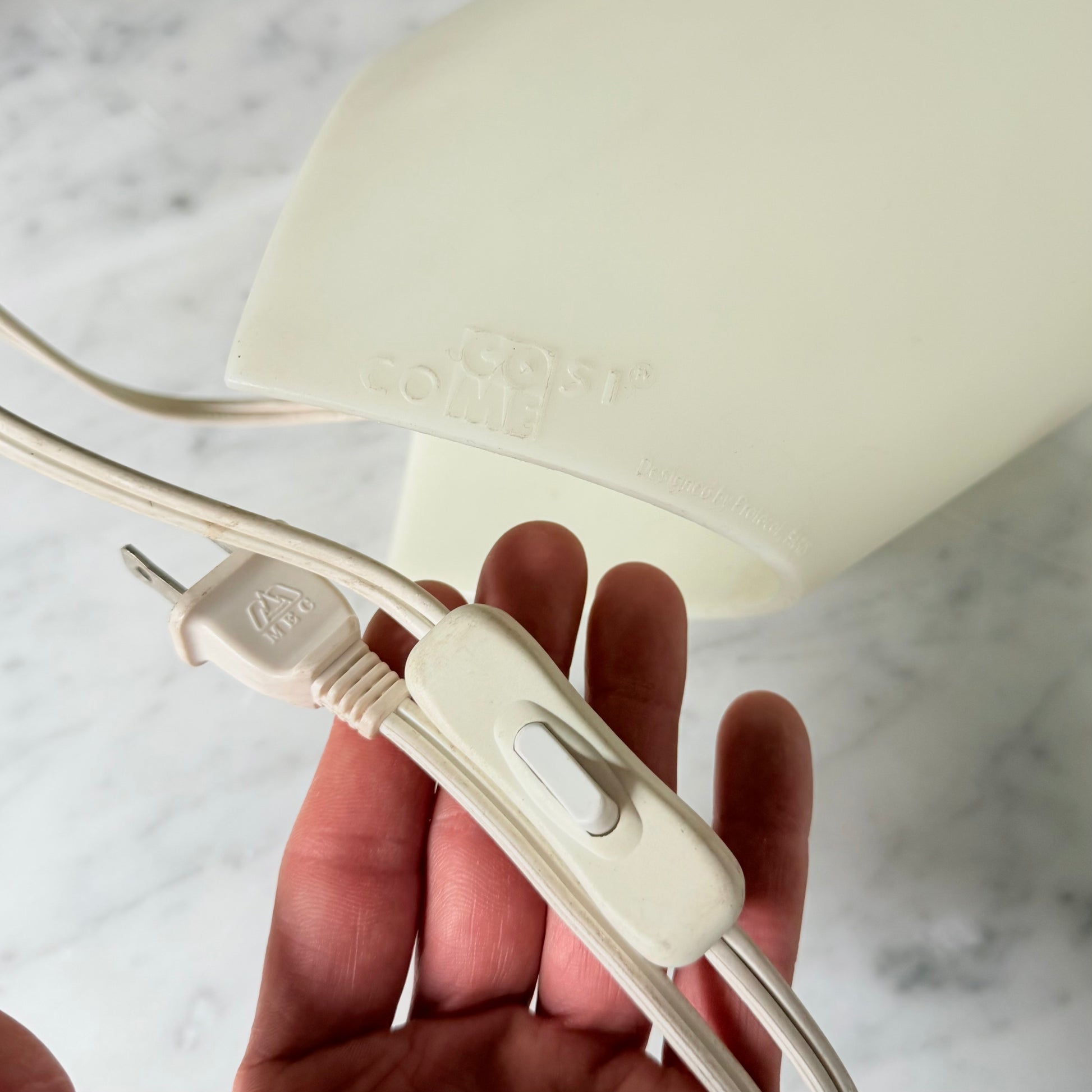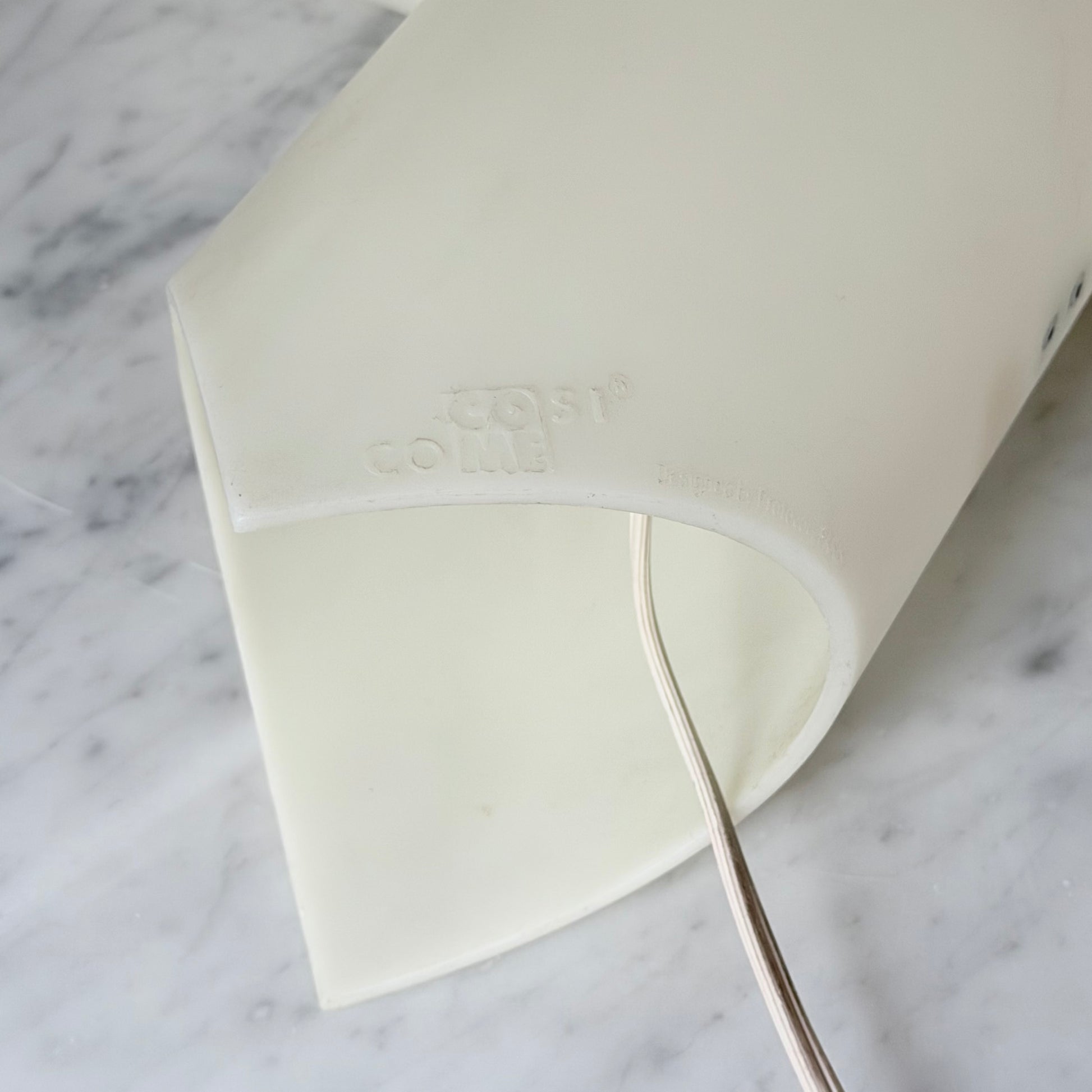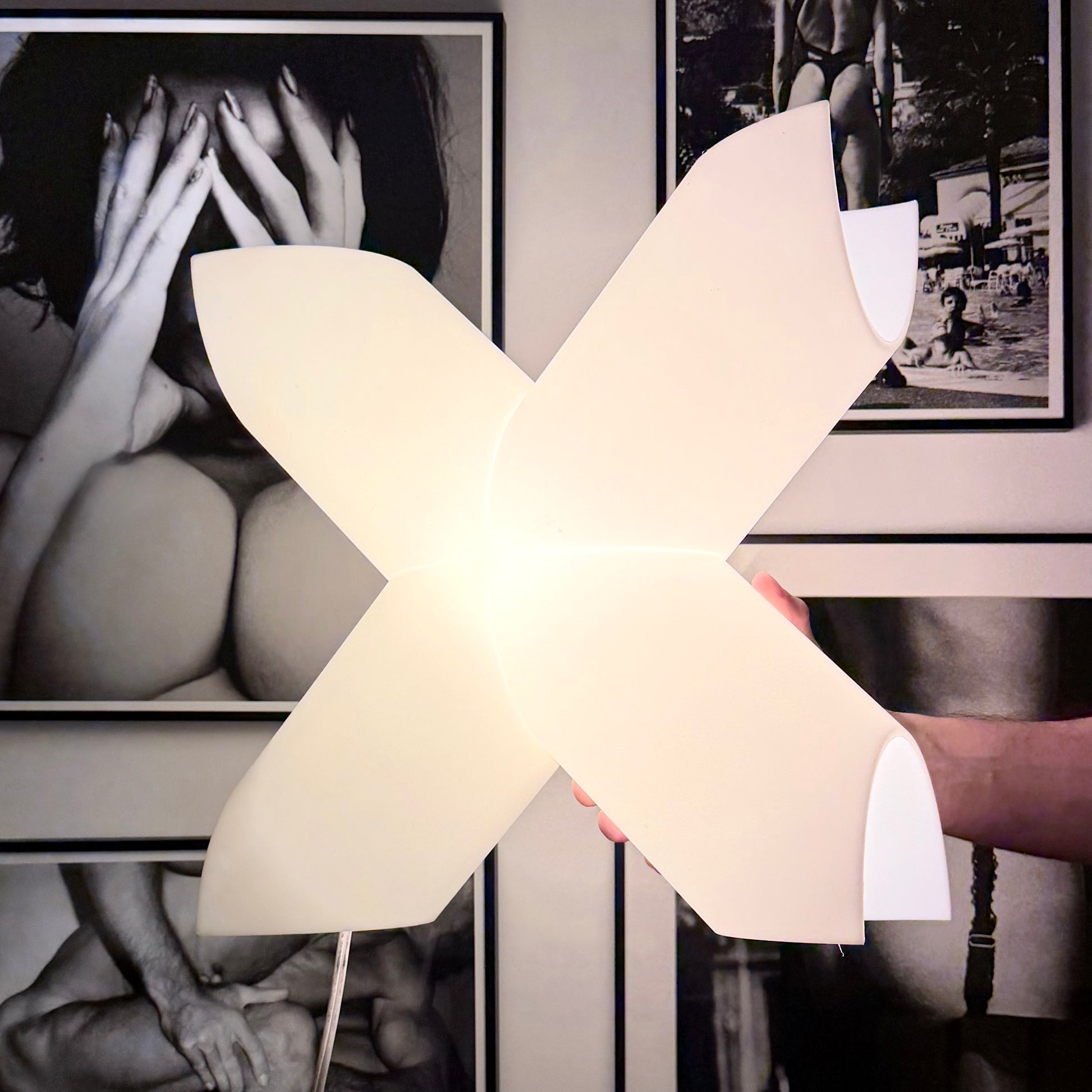 Sculptural X shaped table lamp that can be wall mounted or pendant hung and stacked with others in thick white matte plastic. The ends are bisect cut so have a pointed edge. The hole in the middle back can be used for wall mount. Shows minor age appropriate wear with some scuffs and minor scratches. Pretty rad over all.