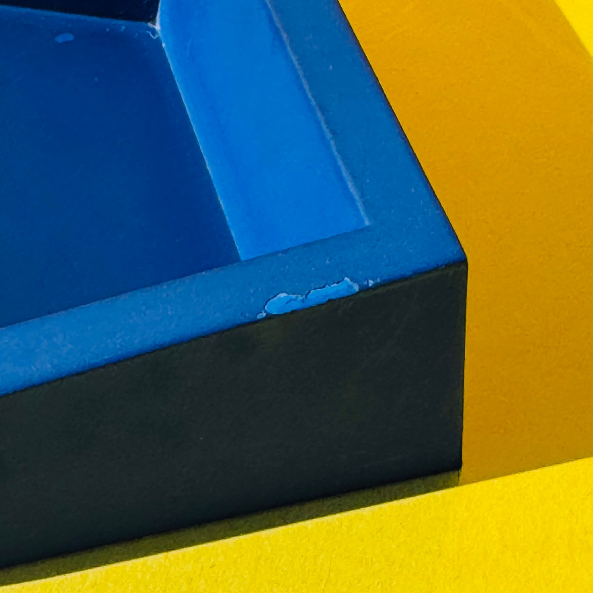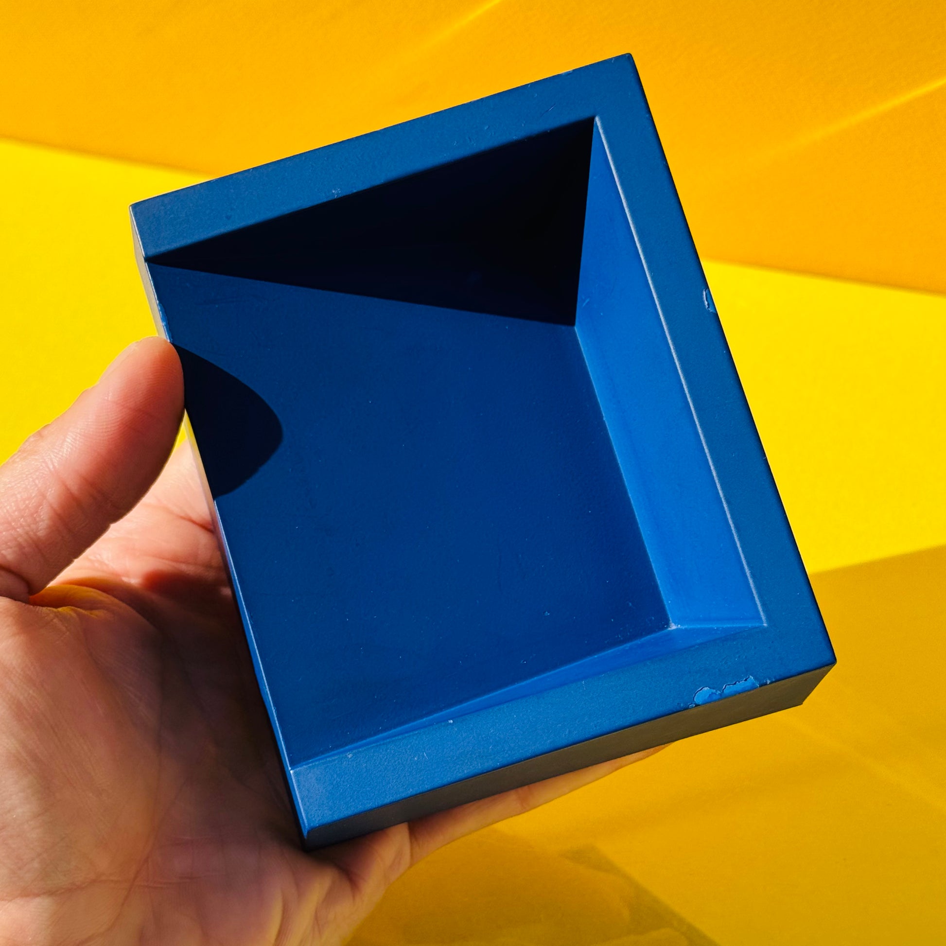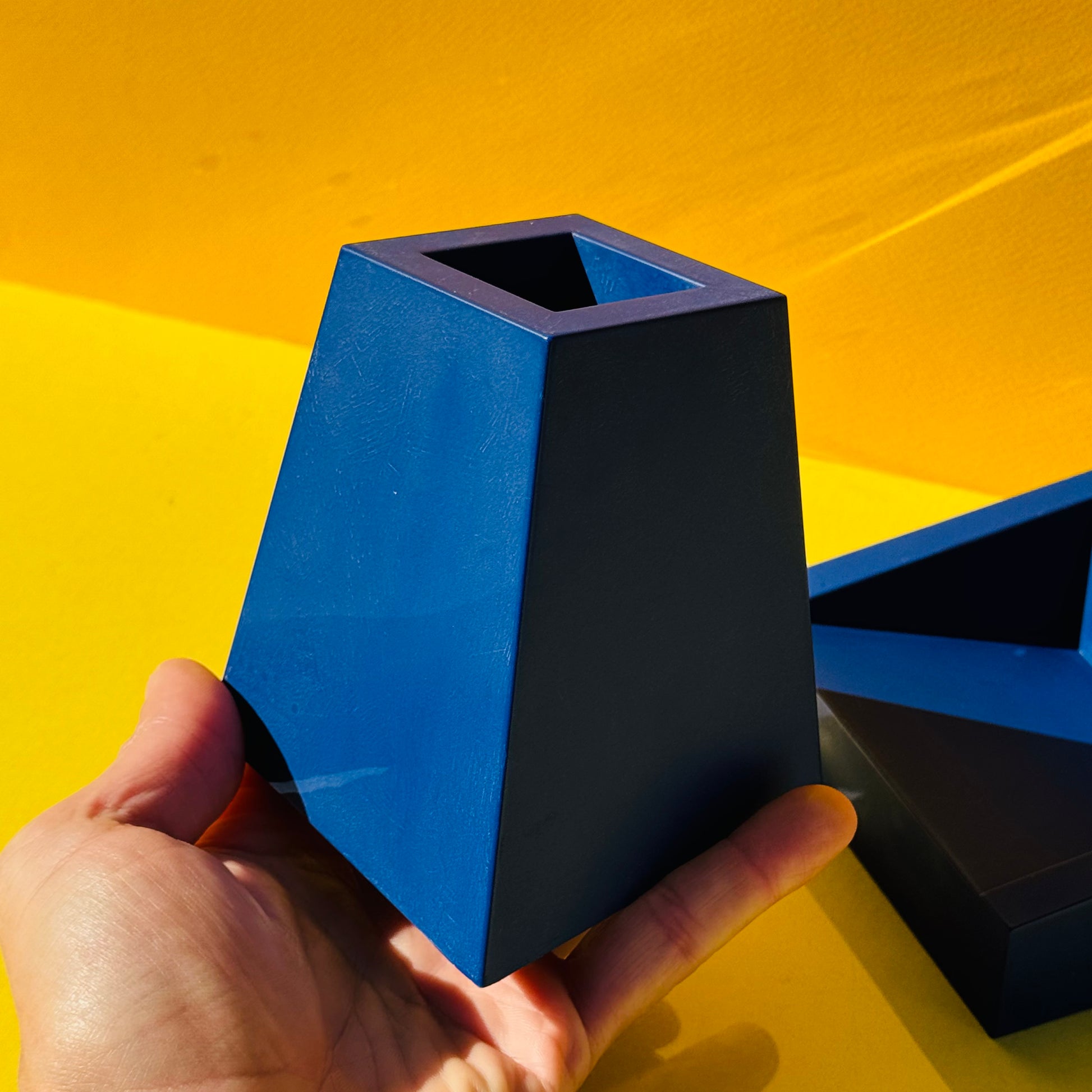 Scarce set of desk accessories by Mari in asymmetrical sculptural Yves Klein blue ABS plastic. Shows some age appropriate wear, some loss to finish on notepad holder. Seemingly hard to find. Sold as a pair.
