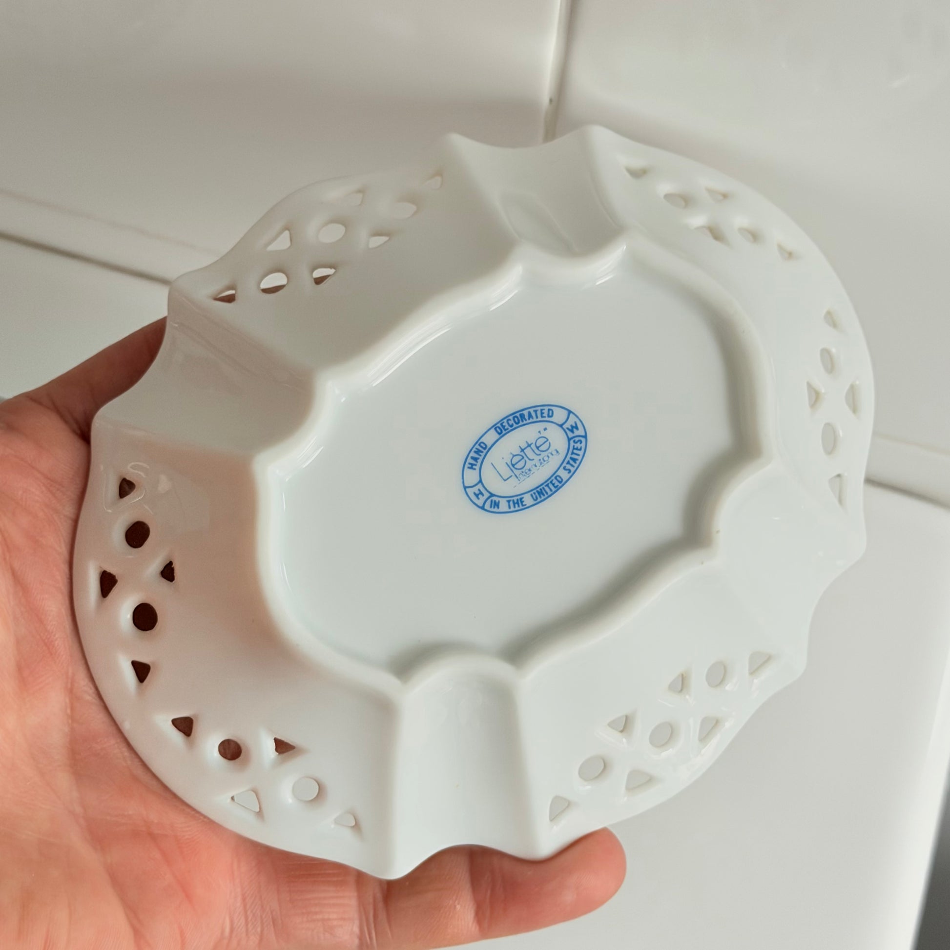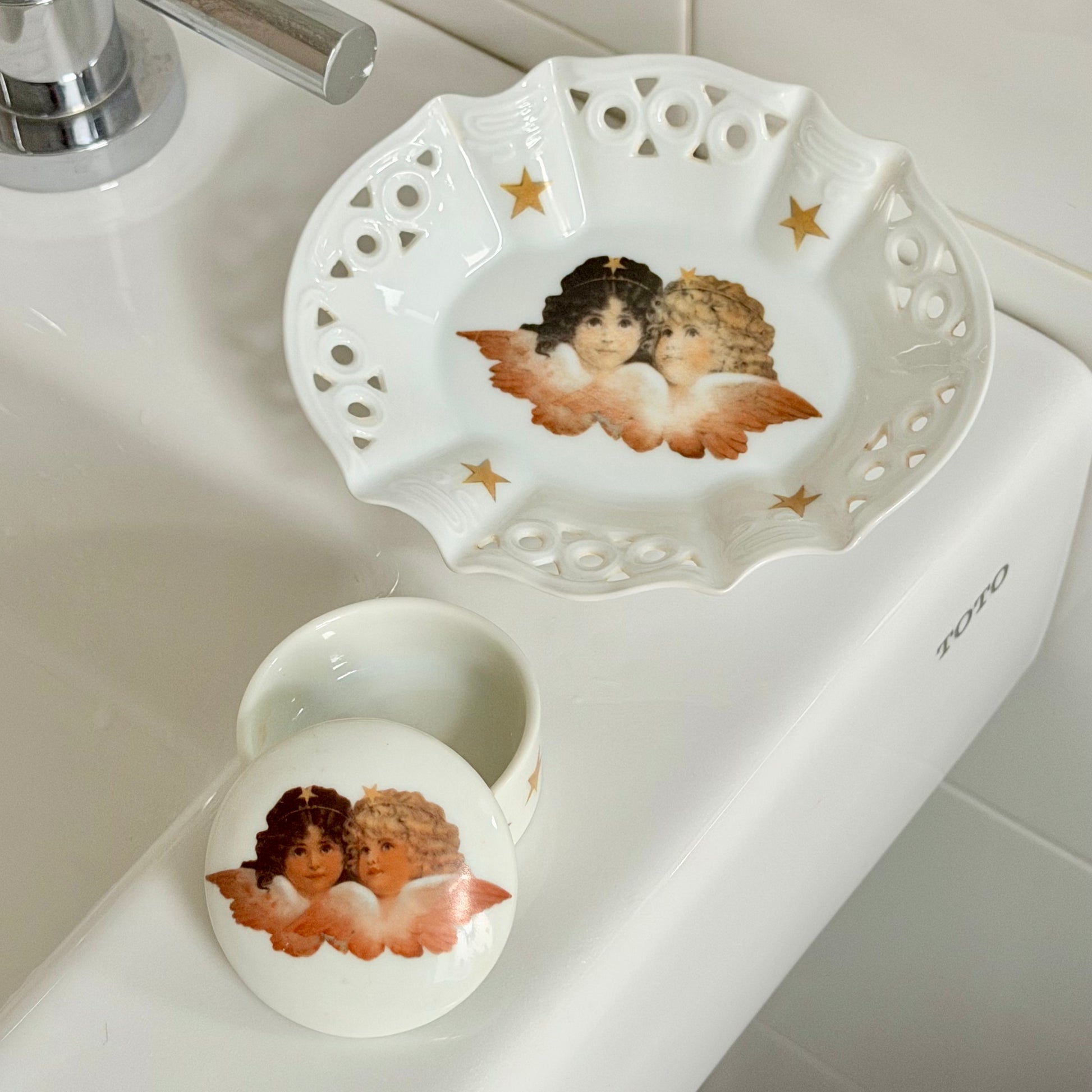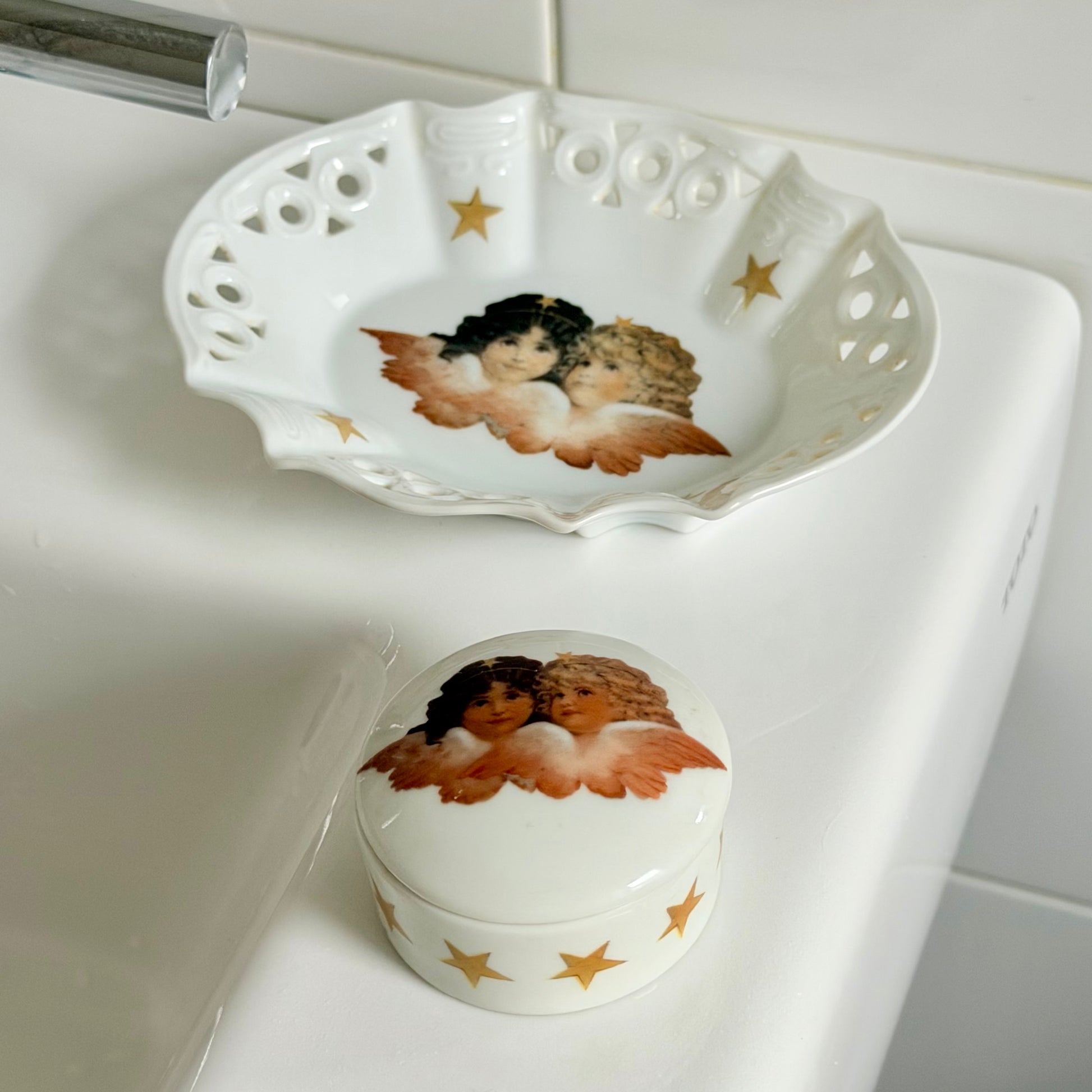 Features ceramic lattice tray / soap dish and small pill box with the iconic Fiorucci angels and star mega graphics. Shows minor age appropriate wear some fading to tray. Sold as a set.