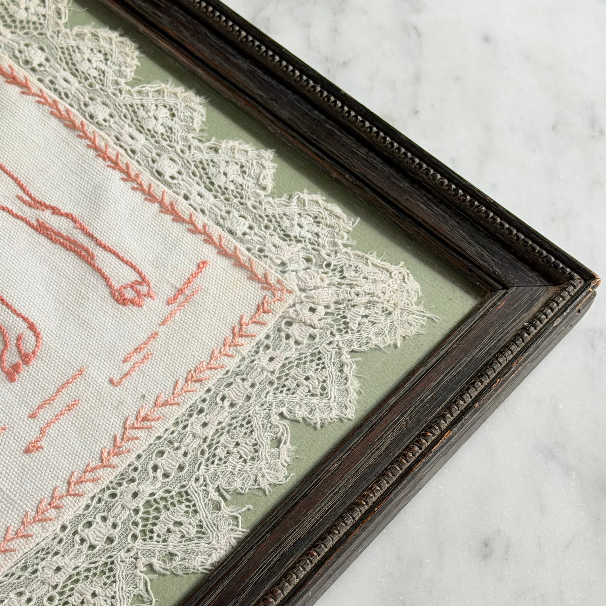 Features rectangular lace bordered textile with pink embroidered pug mounted on green background in textured wood frame behind glass with hanging bracket. Shows minor age appropriate wear with some tears to backing. I mean, this is the cutest damned thing I've seen in a long time.
