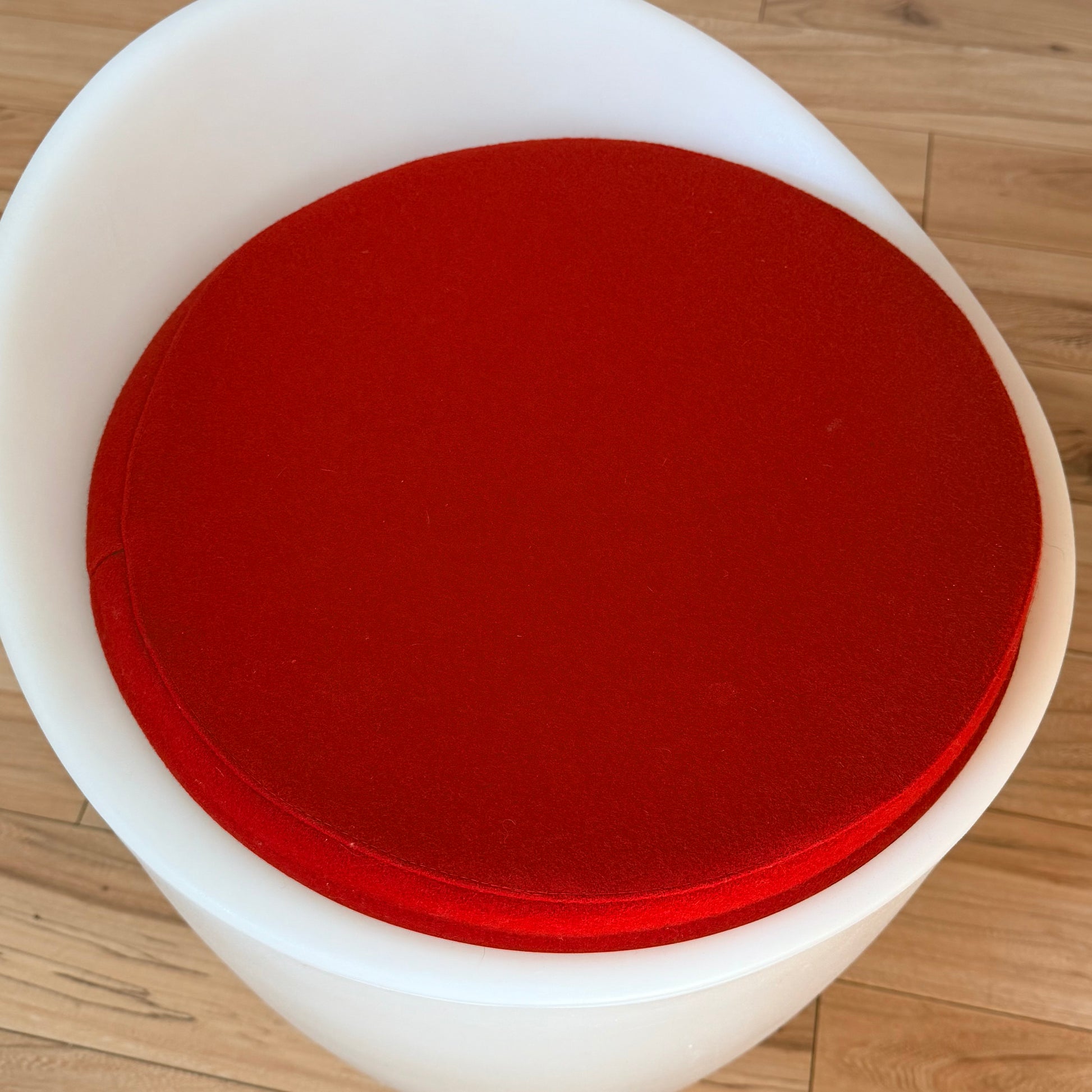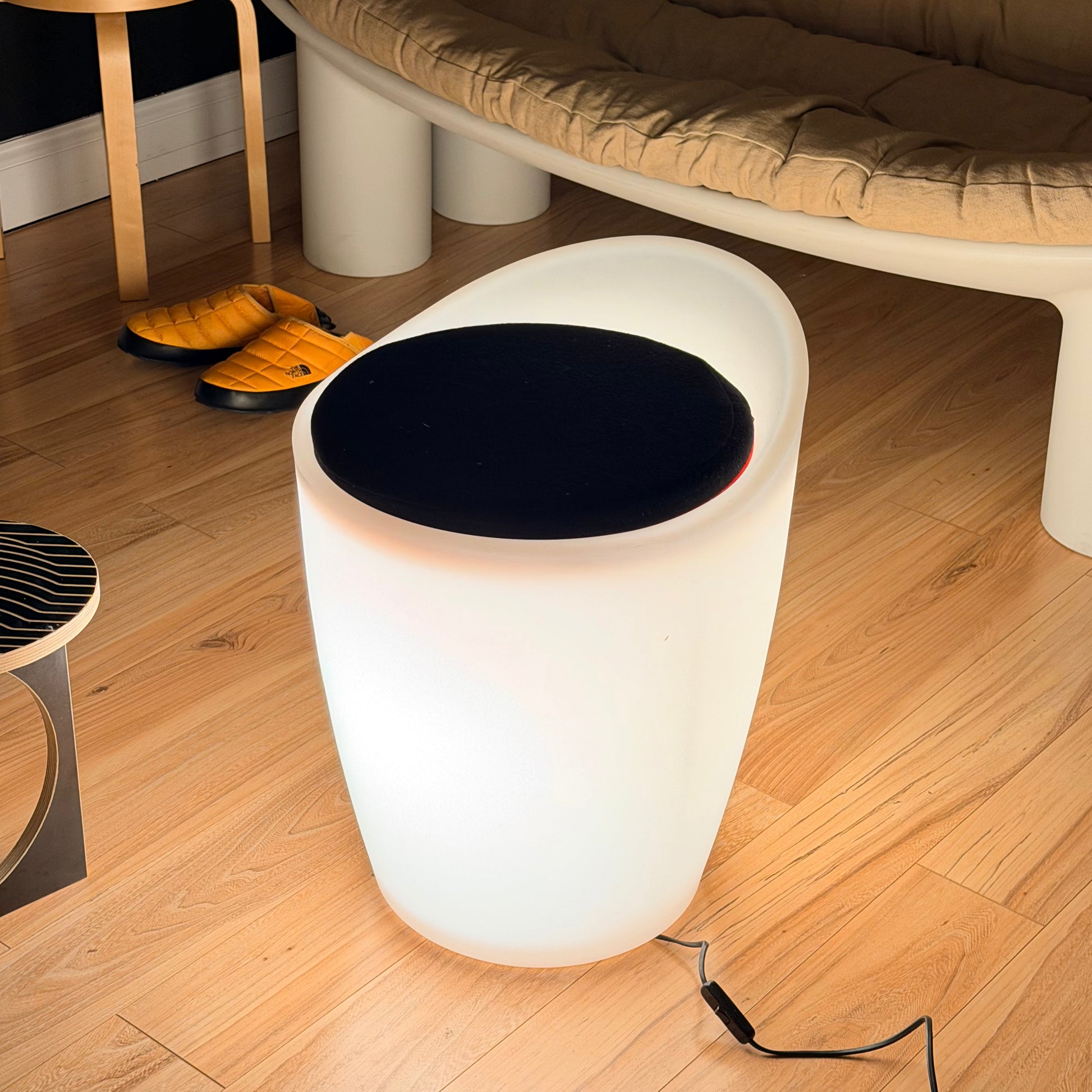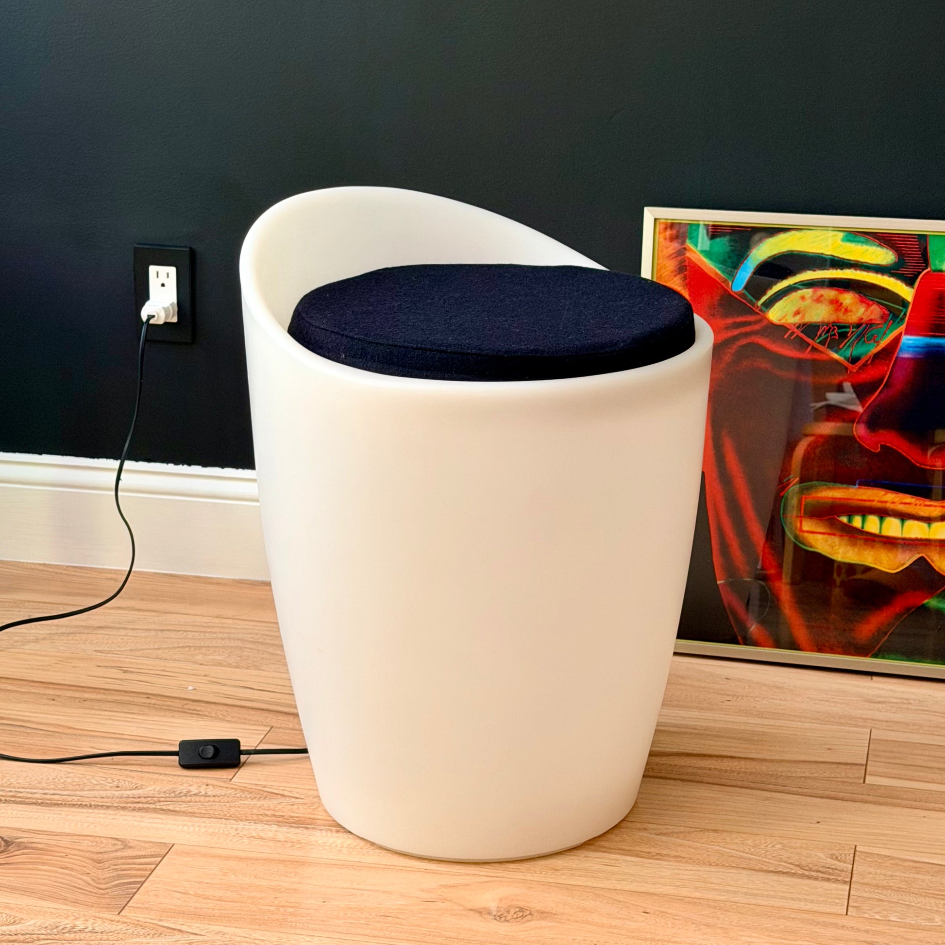 Features translucent white rotationally molded polyethylene body with reversible black and red felt seat. Functions as a chair and a lamp a novel idea at the time. Seat has removable cover. Its slightly larger than an Aalto stool for reference. Minor age appropriate wear, shows excellently and a rare find.