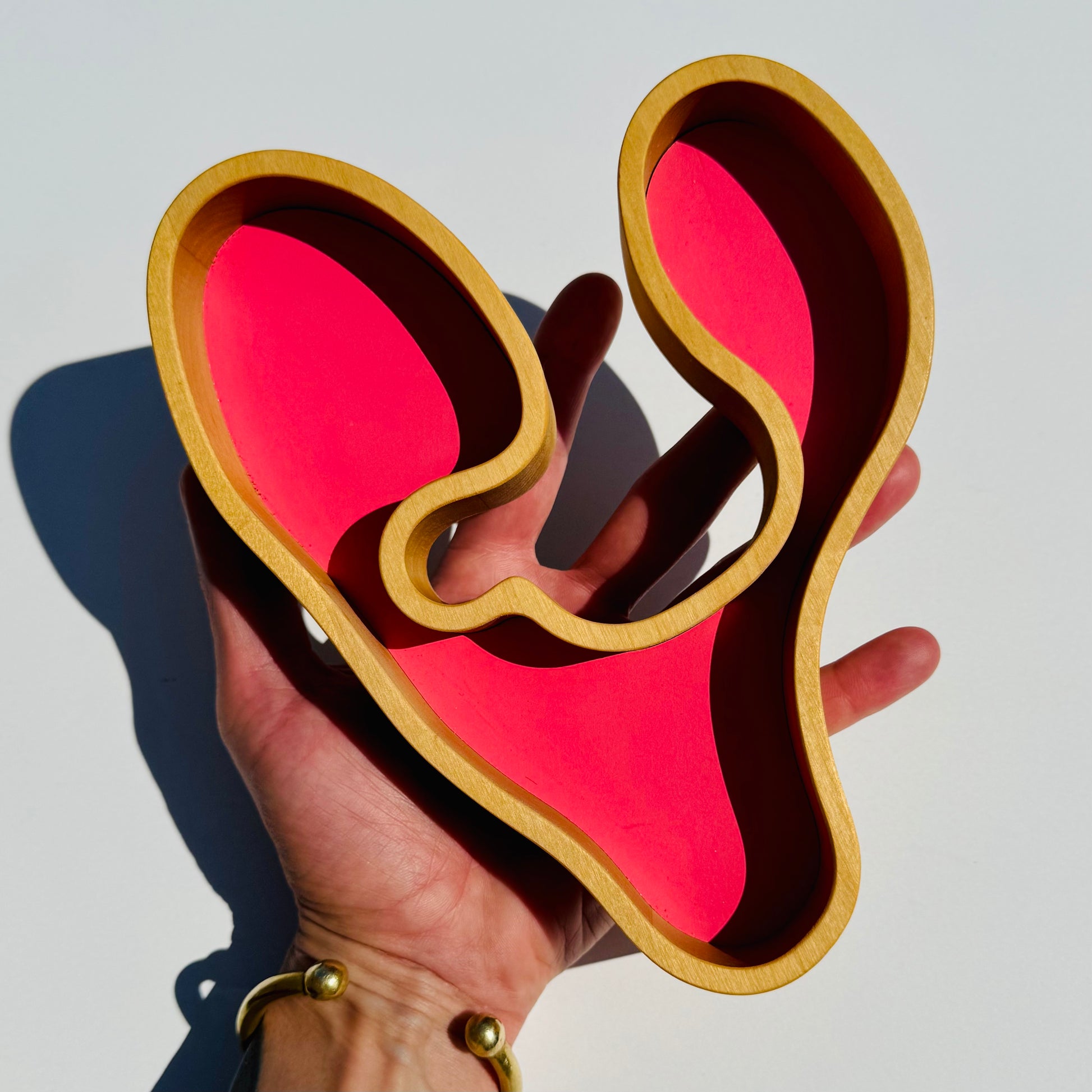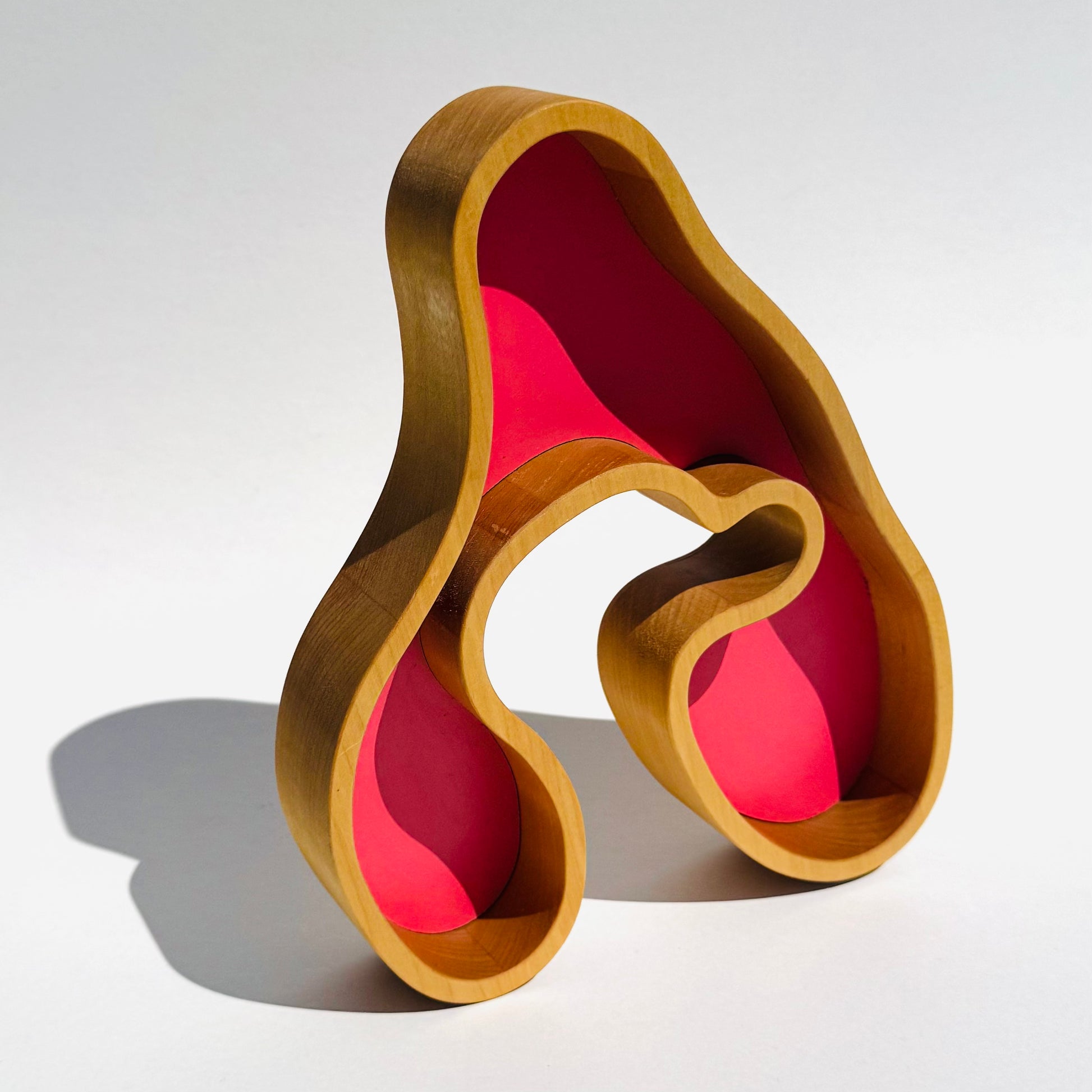 Features biomorphic birch wood body with coral / red linoleum interior. Reminiscent of the Aalto Savoy vase in combo with an E60 stool. It's a good one in excellent condition.