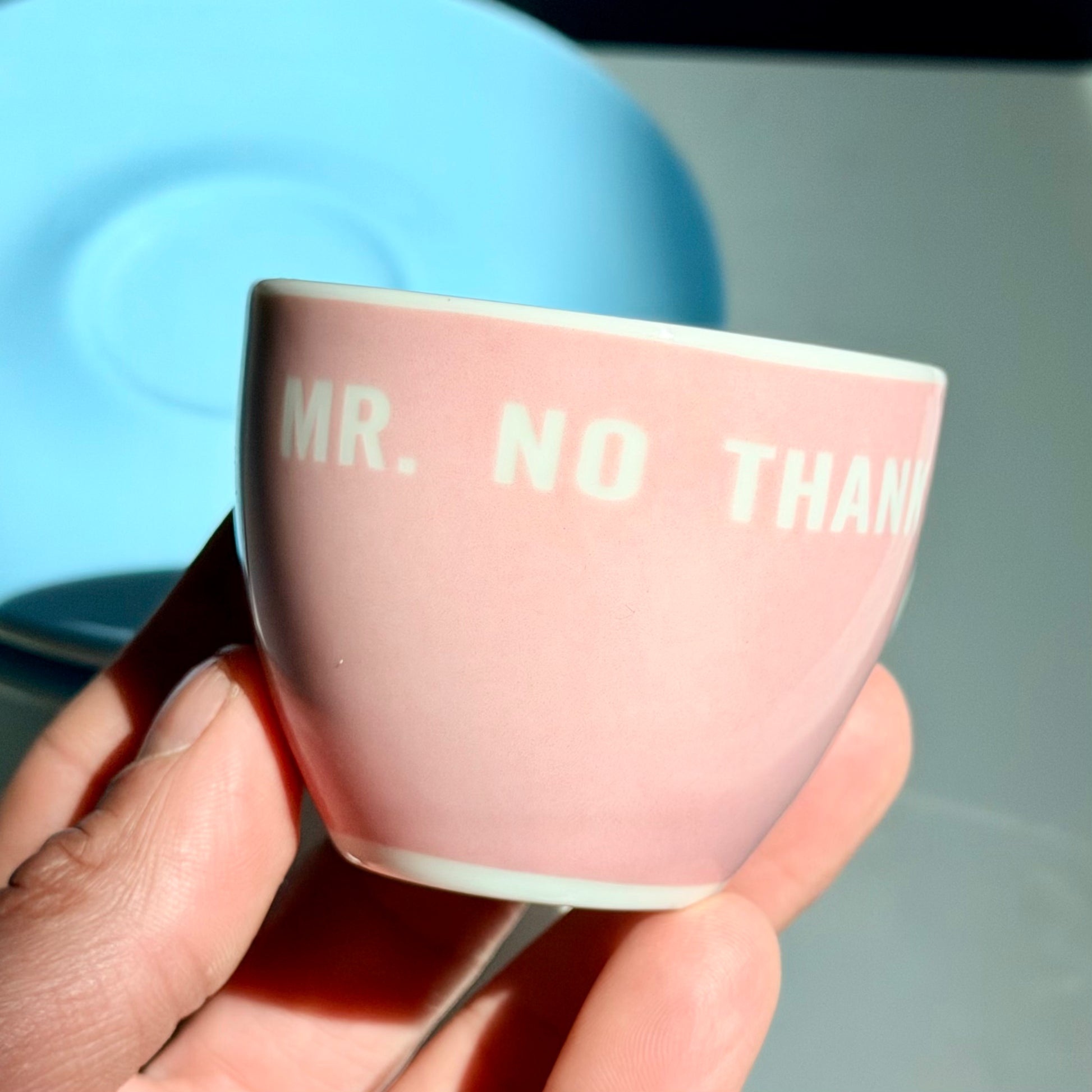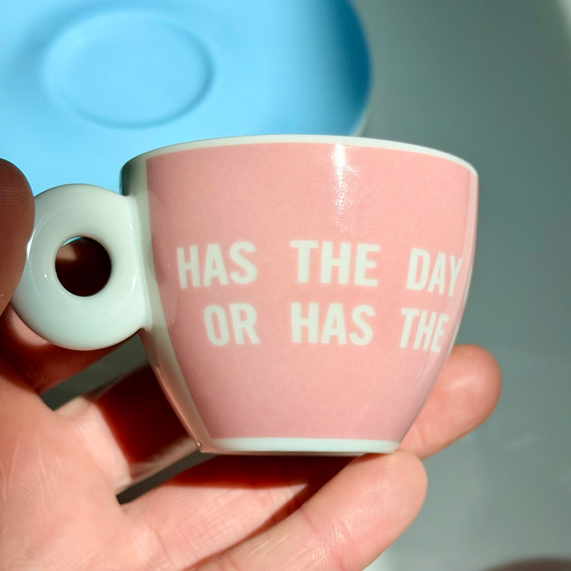 Feature signed, numbered, and themed porcelain focusing on childhood, gender, and emotional themes in text on pink porcelain cup with blue saucer plate. Minimal age appropriate wear. Sold as a set of two.
