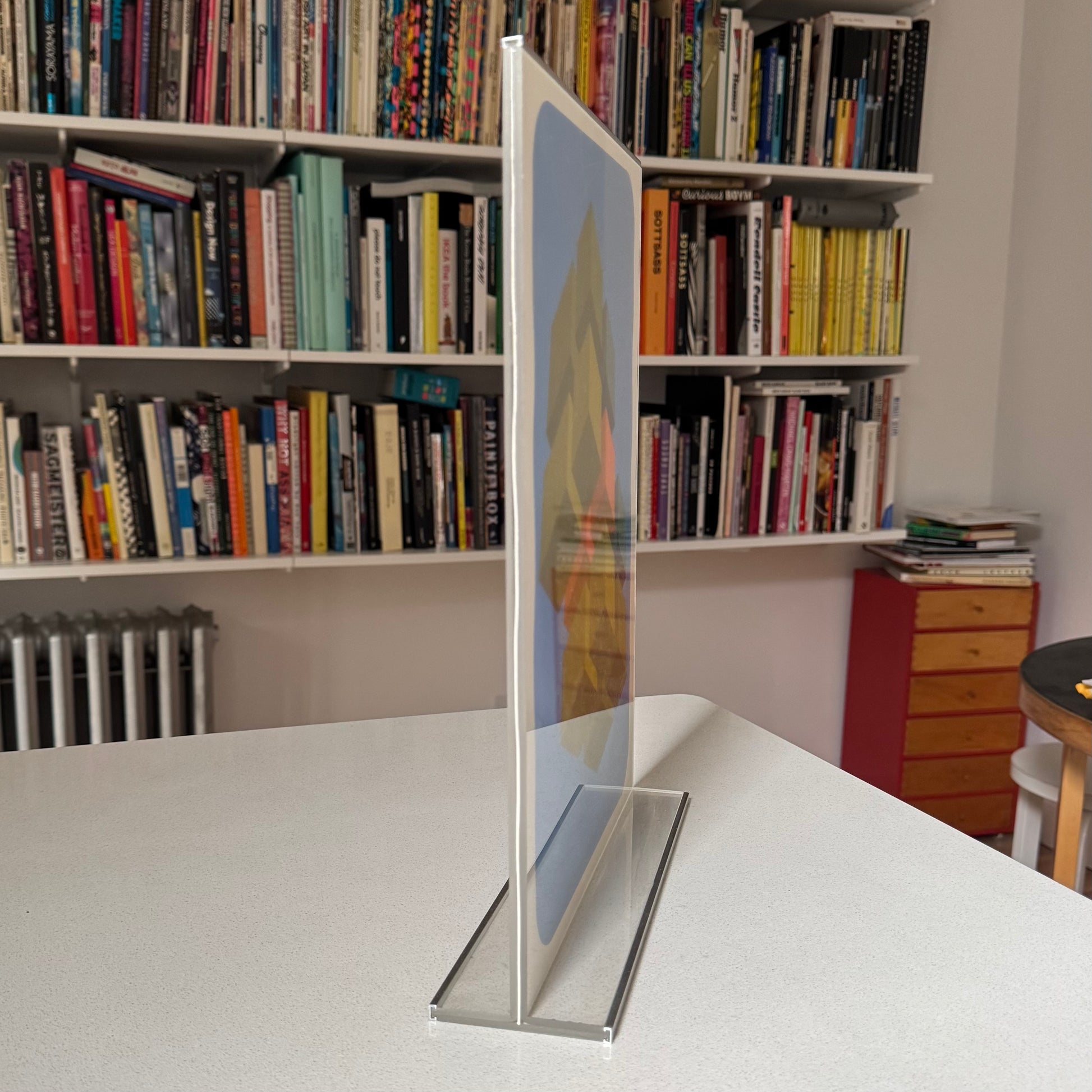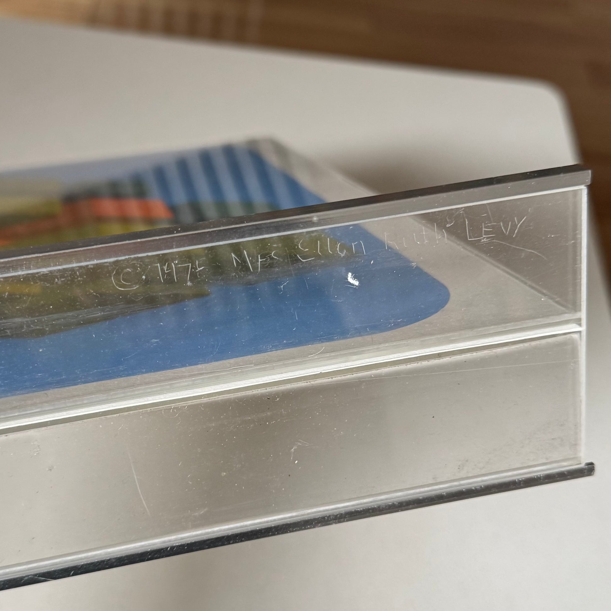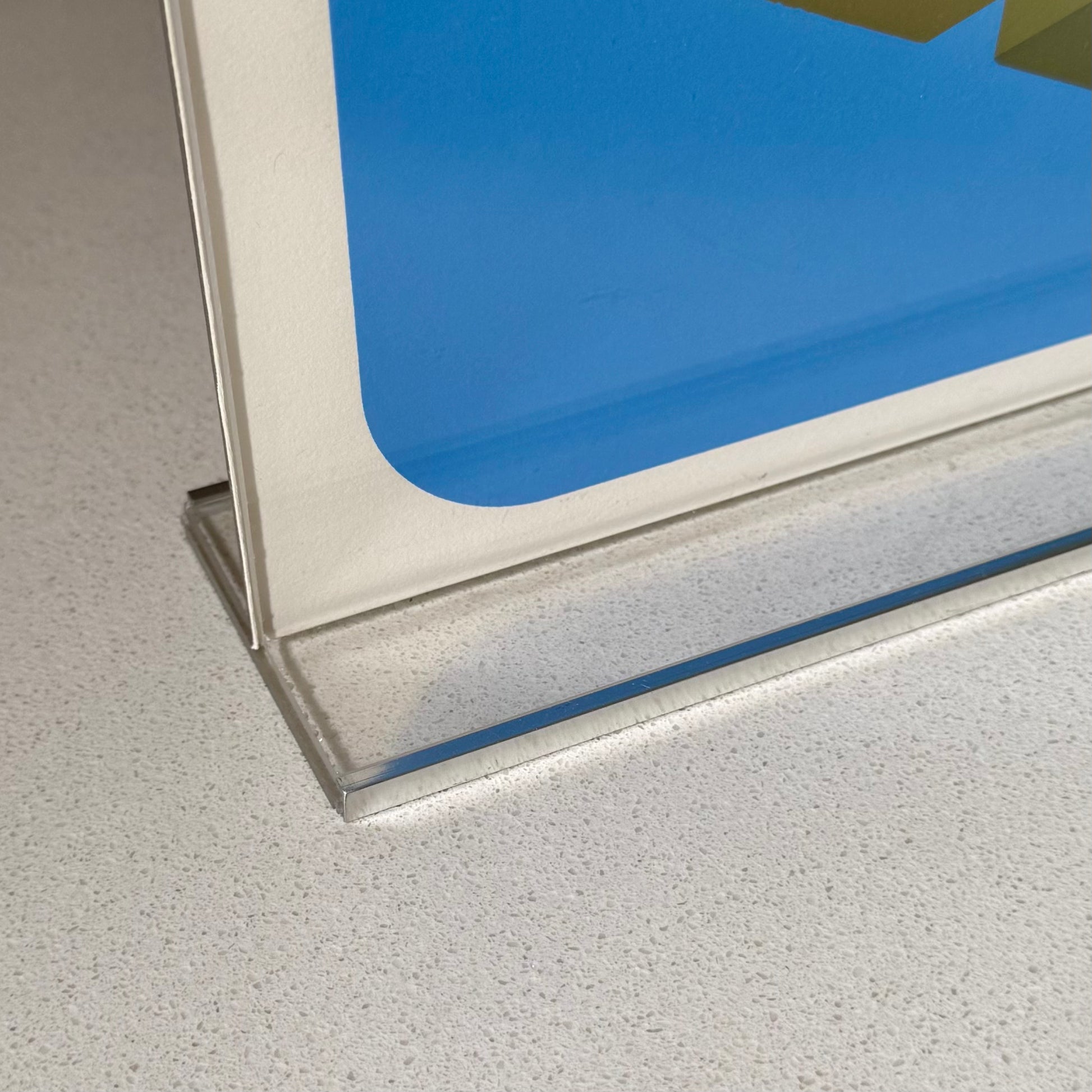 Features op art / hard edge mega graphic of green, orange and teal cubes floating in form on sky blue background with white border. In custom standing acrylic frame with brushed chrome details. Reverse of silkscreen has a quote from the artist. Frame has minor age appropriate wear, scuffs. Shows excellently. A great stand alone bookshelf piece.