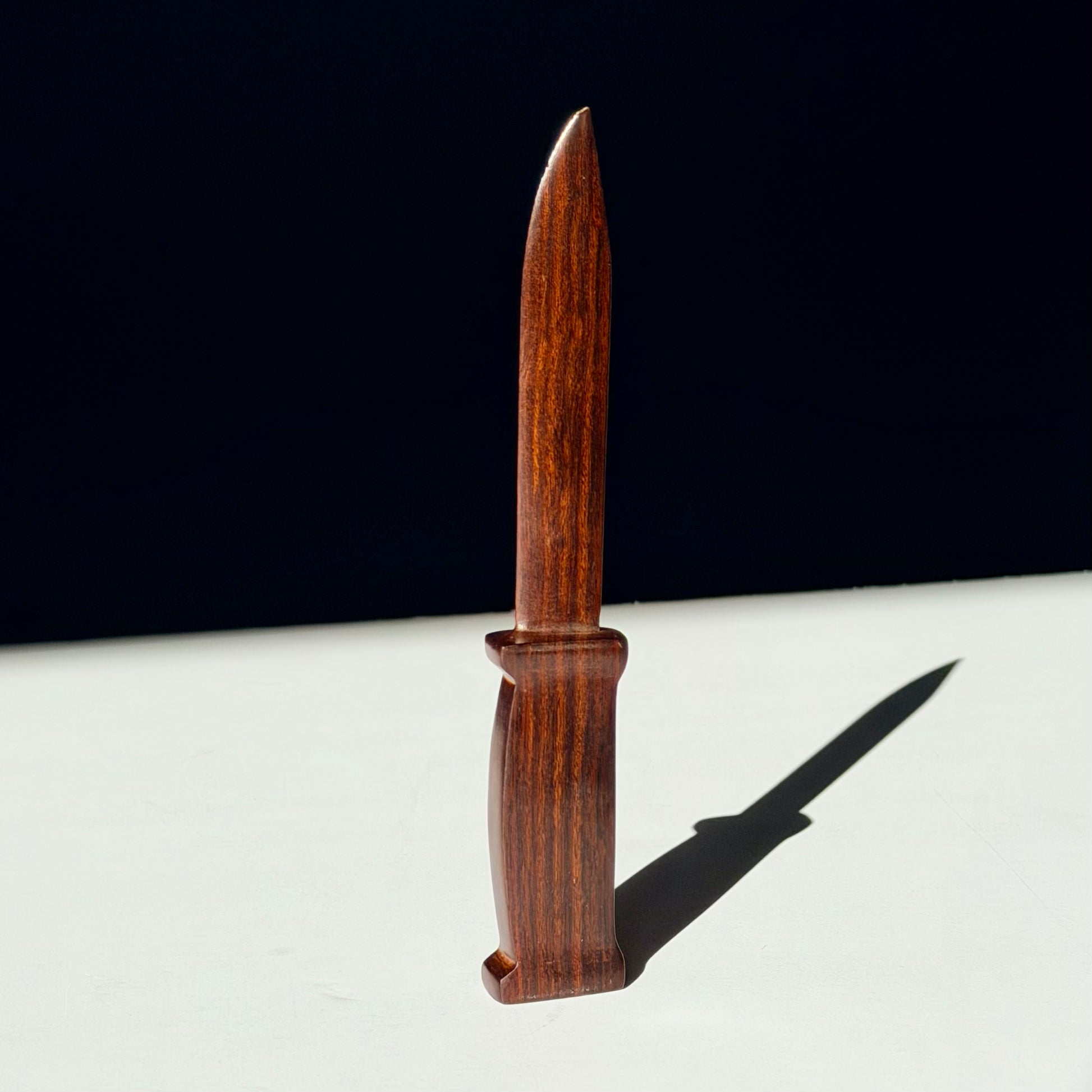 Life sized straight edge knife in glossy grained rosewood. Maybe its a letter opener, maybe its a weapon, maybe it's the classiest damn knife you ever did see. Minor age appropriate wear the very tip of the knife is either knicked or was carved that way.