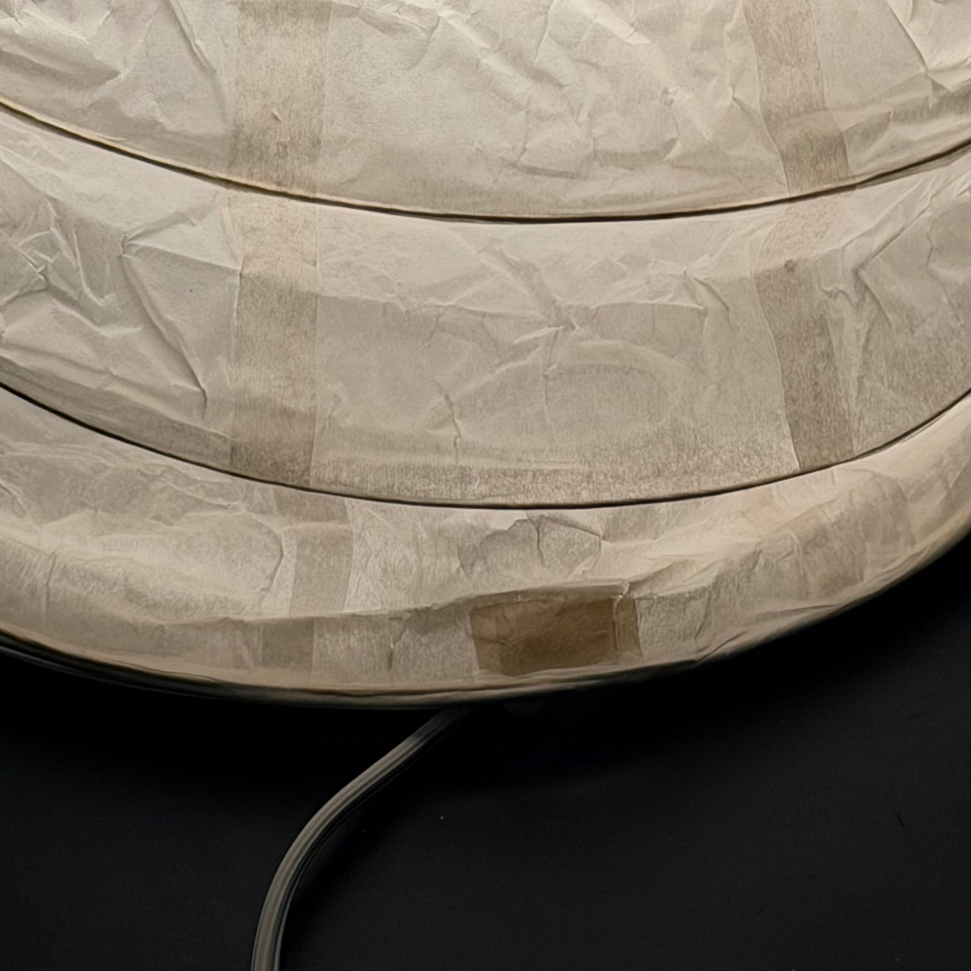 Features Noguchi/Akari-esque sculptural rice paper shade on metal lamp base/frame. Shell is worm like in shape and when assembles resembles a large shell or larvae. On/Off switch on cord with light bulb included. Some minor age appropriate wear with repaired small tear at base as pictured, works and shows excellently. A scarce example of one of these. Assemble with caution.