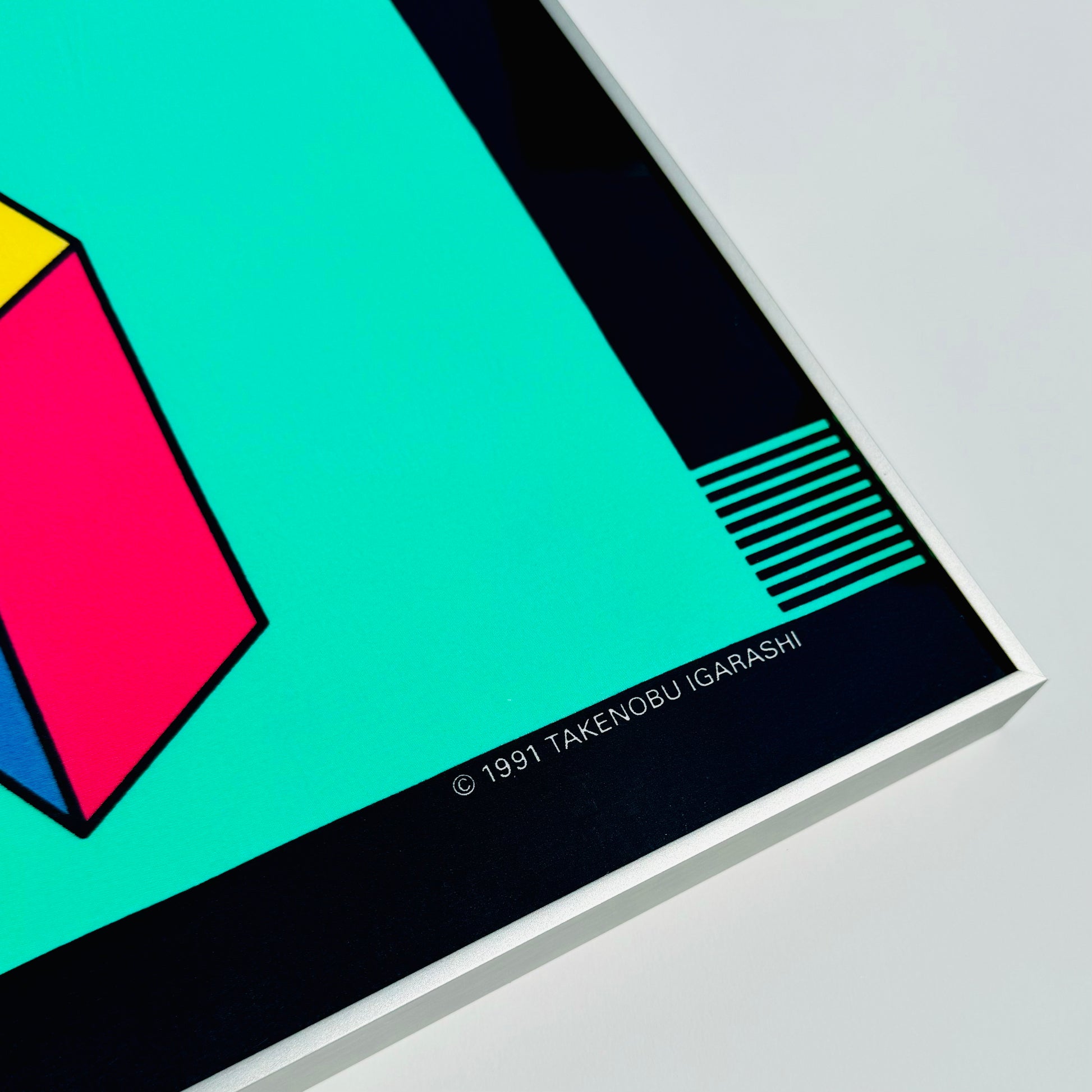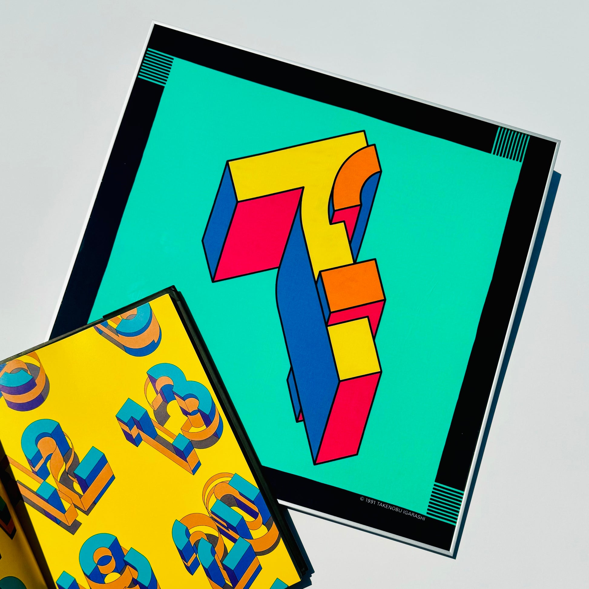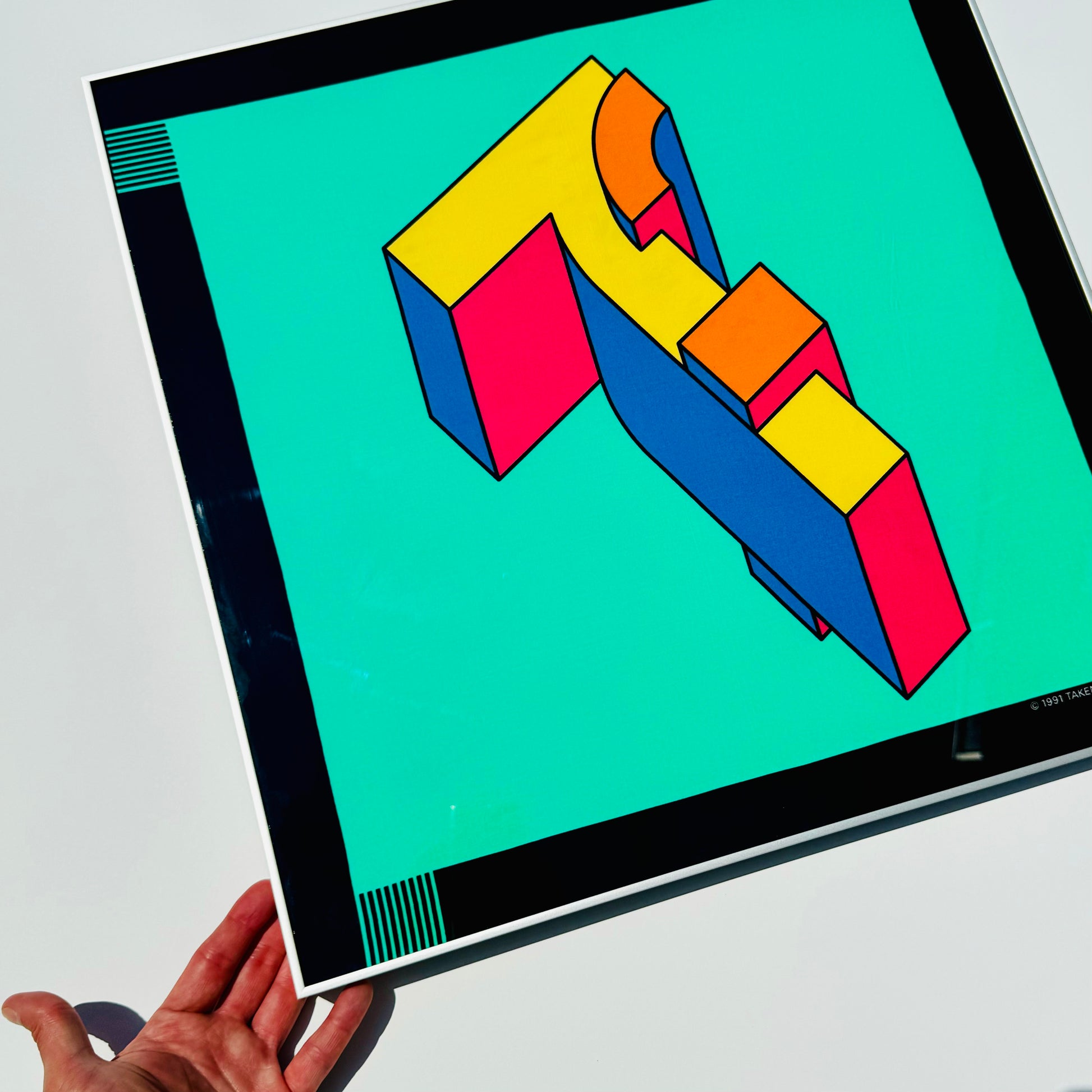 Features iconic typography of the legendary graphic designer Takenobu Igarashi. A floating 3D number 7 in yellow, blue, pink and orange on teal background with black border. Textile shows minor age appropriate wear with minor crease lines and slight warp as pictured. Behind glass in chunky chrome frame. A very scarce find and pretty incredible tbh. One for the fellow graphic design nerds.