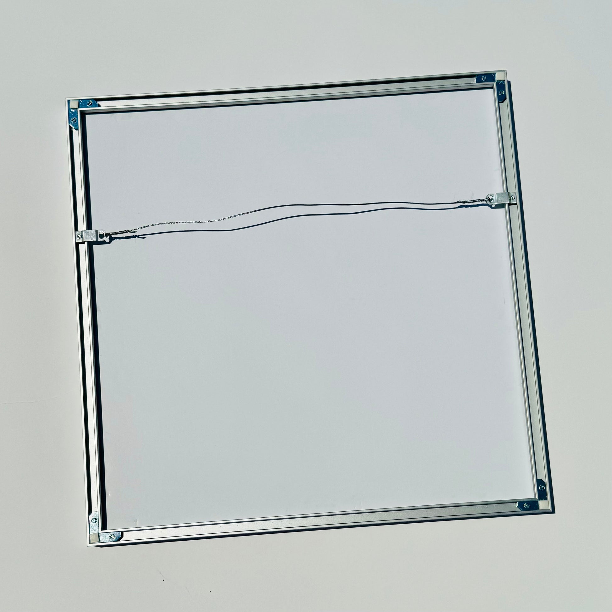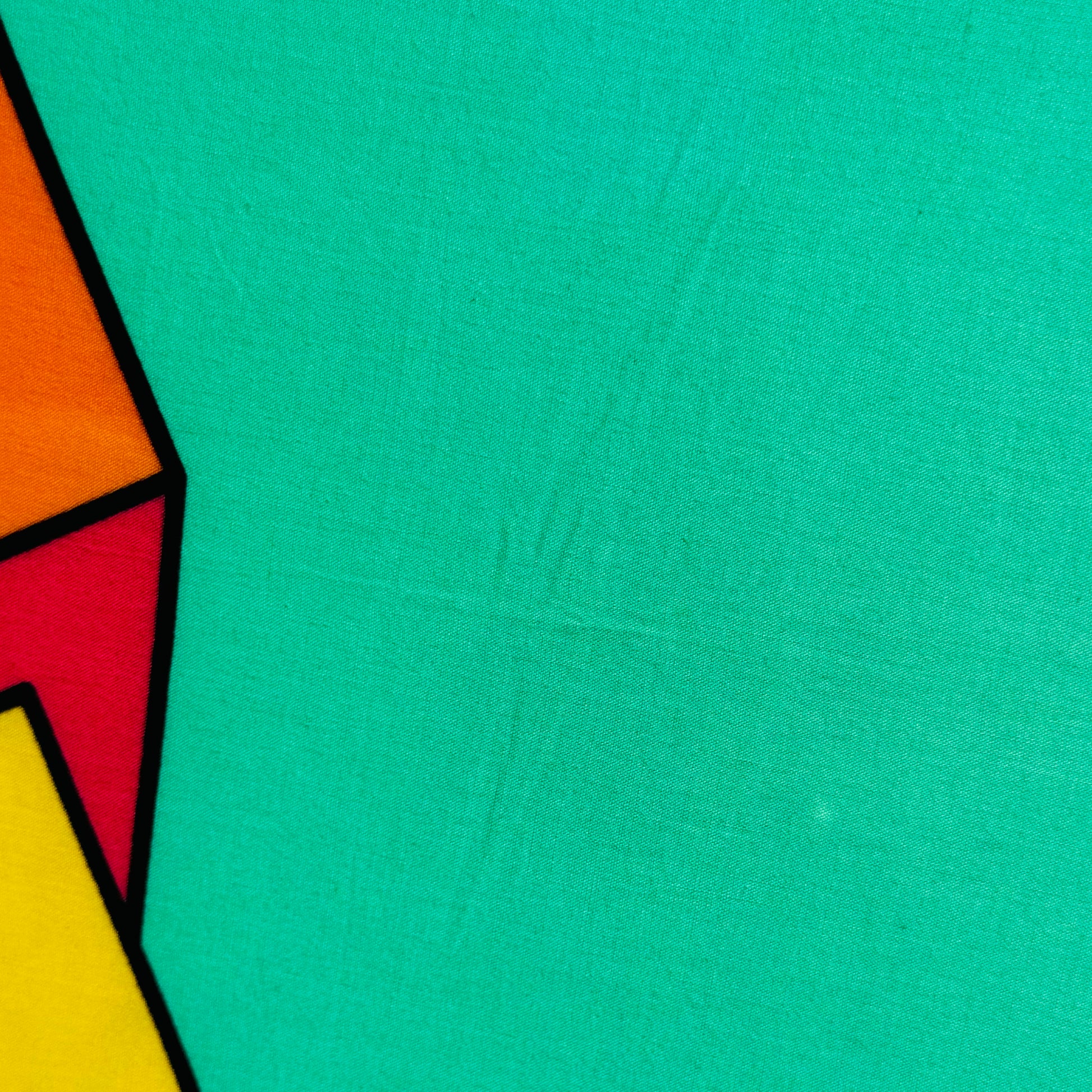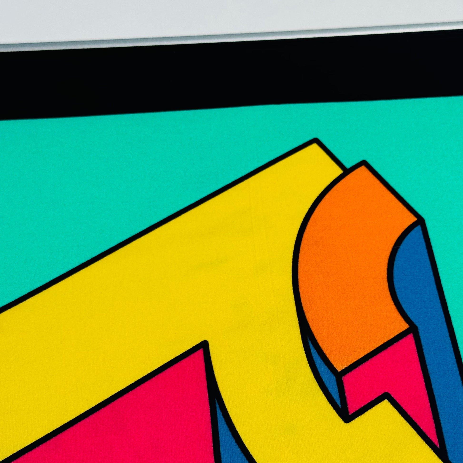 Features iconic typography of the legendary graphic designer Takenobu Igarashi. A floating 3D number 7 in yellow, blue, pink and orange on teal background with black border. Textile shows minor age appropriate wear with minor crease lines and slight warp as pictured. Behind glass in chunky chrome frame. A very scarce find and pretty incredible tbh. One for the fellow graphic design nerds.
