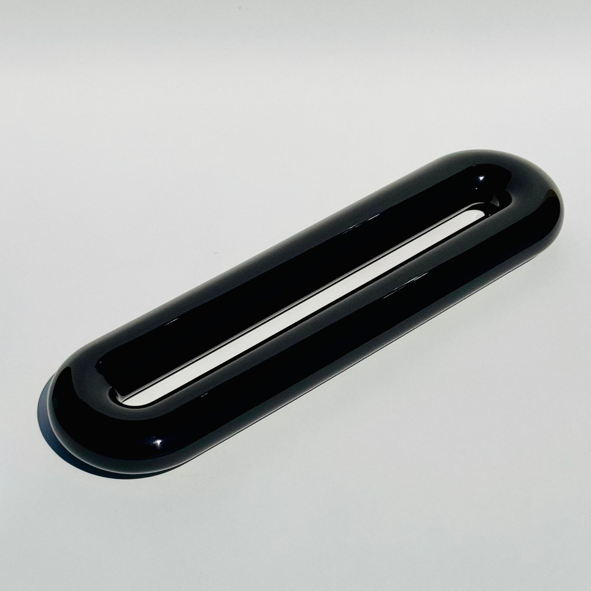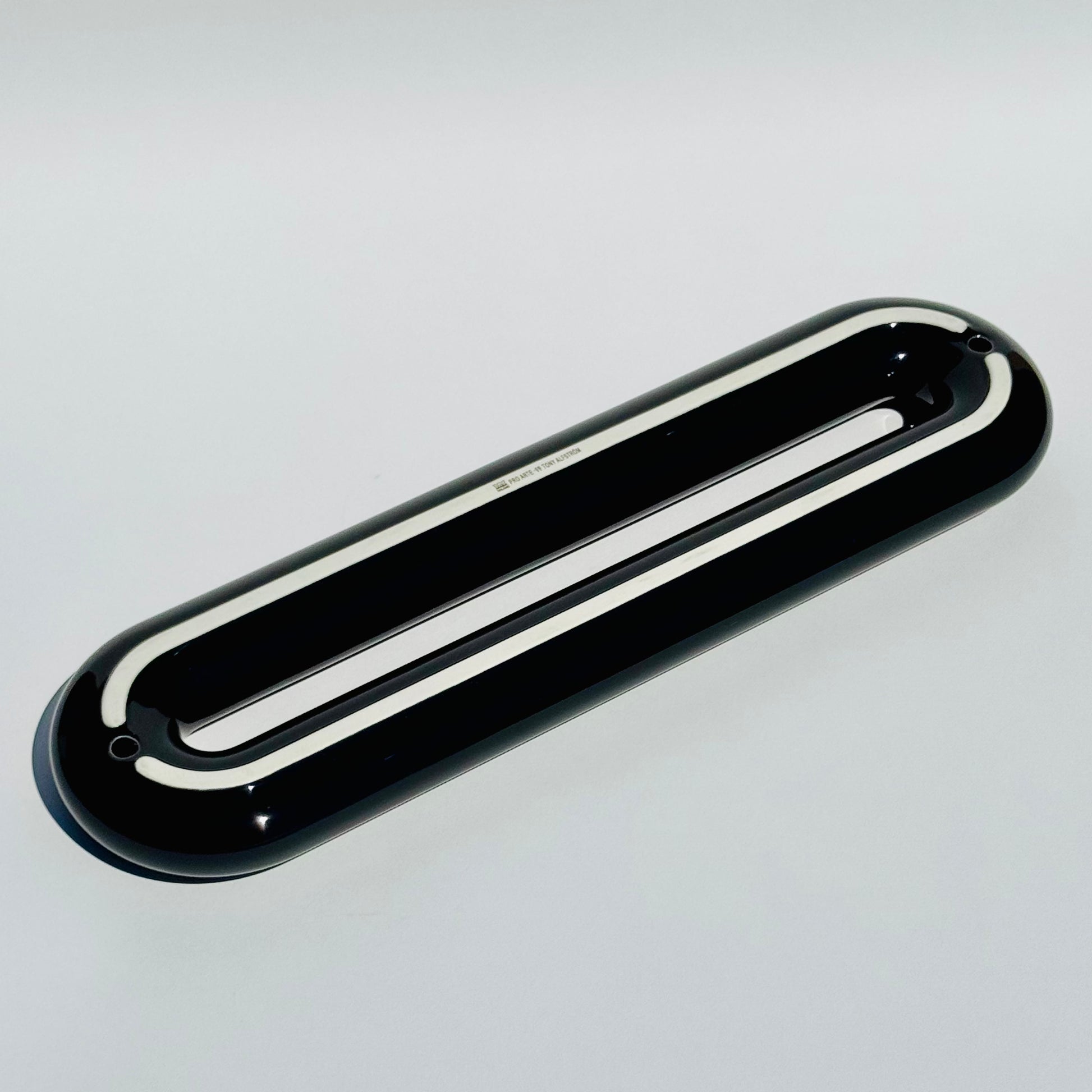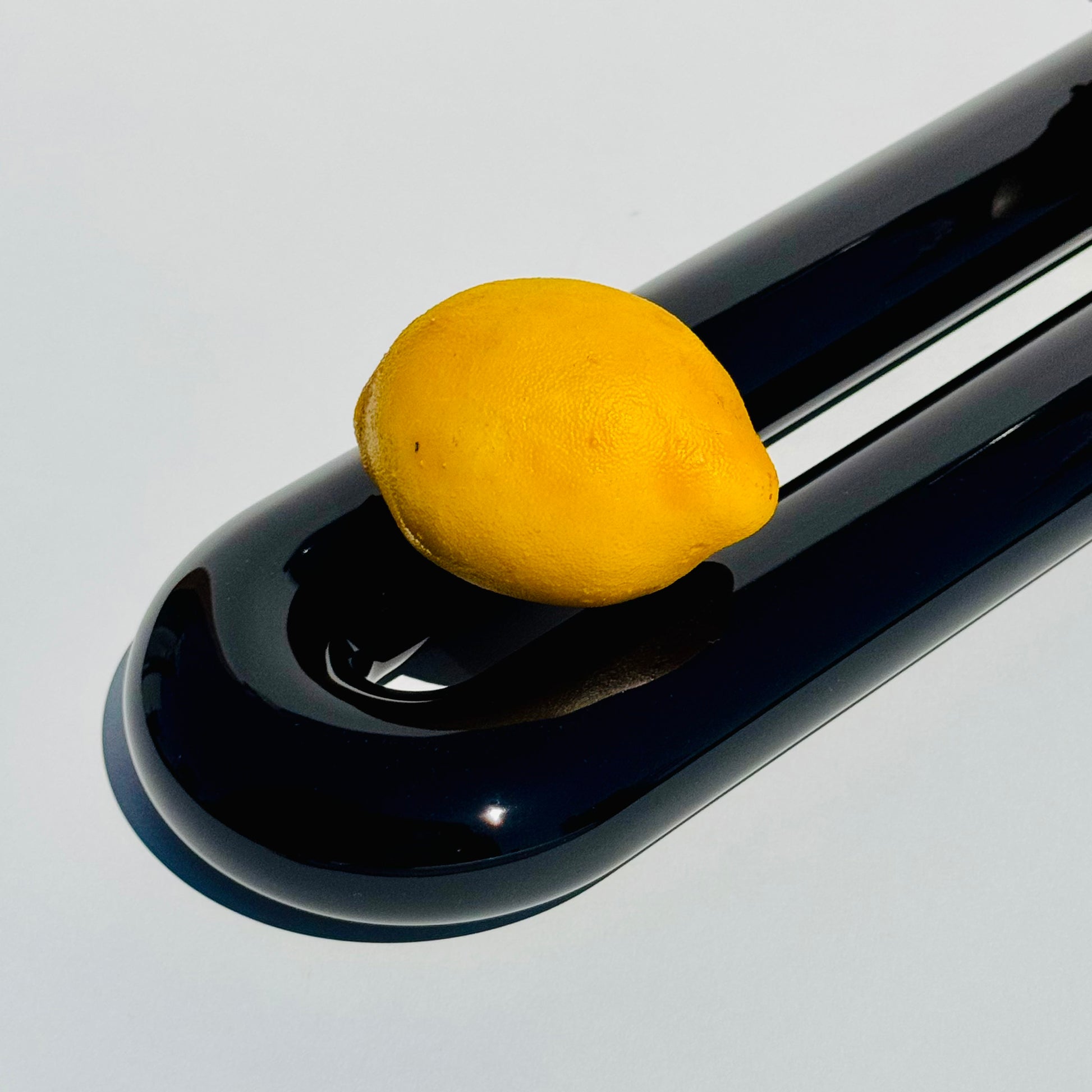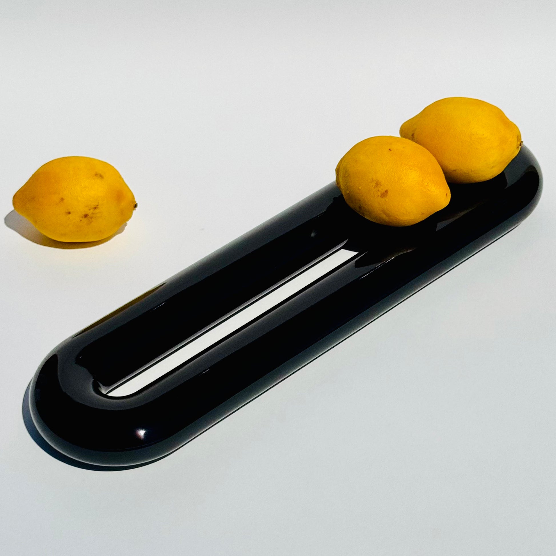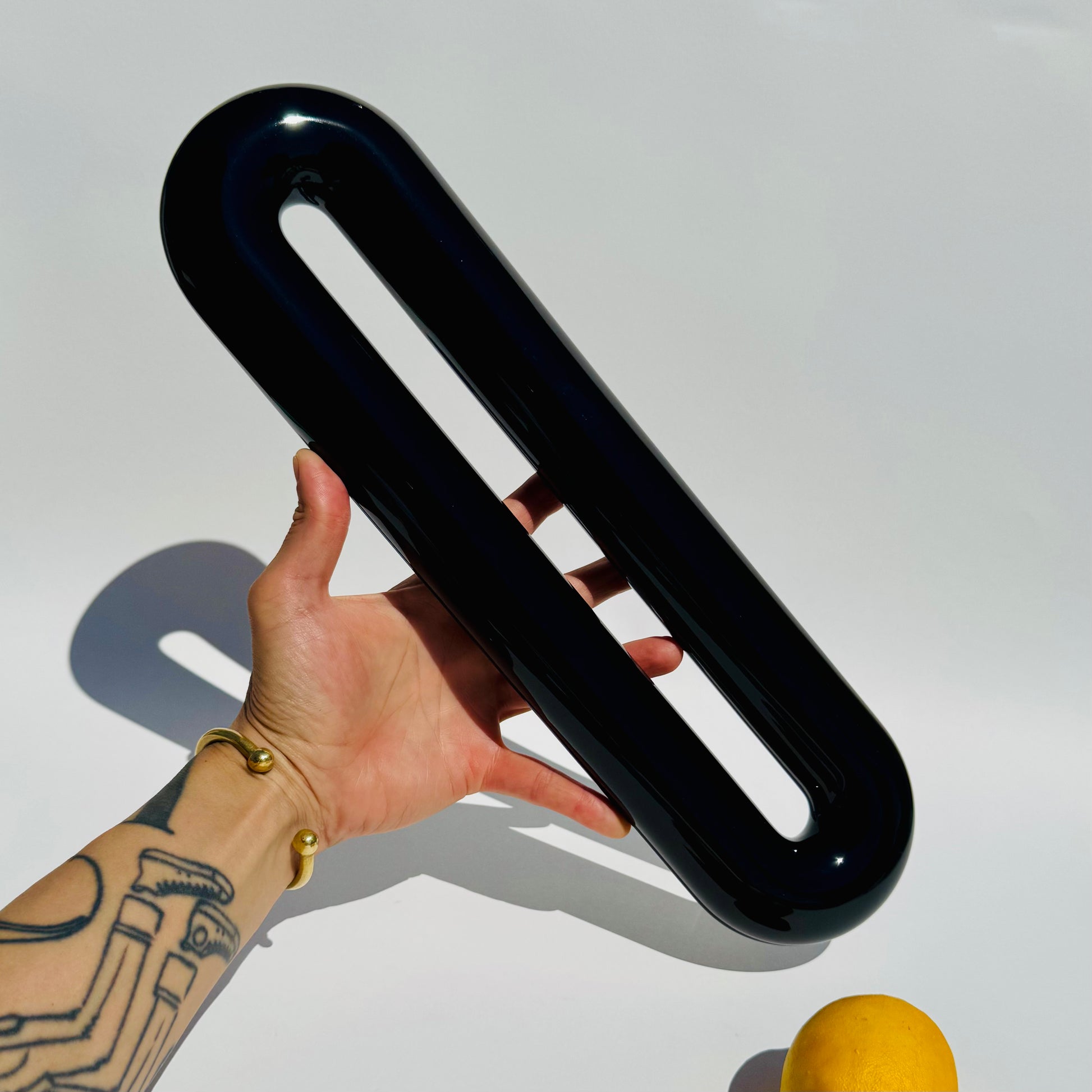 Features heavy porcelain body in space age / Y2K / minimalist form with black high gloss glaze. Large and sculptural in excellent condition signed on base. A super scarce find in top notch material. Suitable as a fruit bowl, catchall, table sculpture.