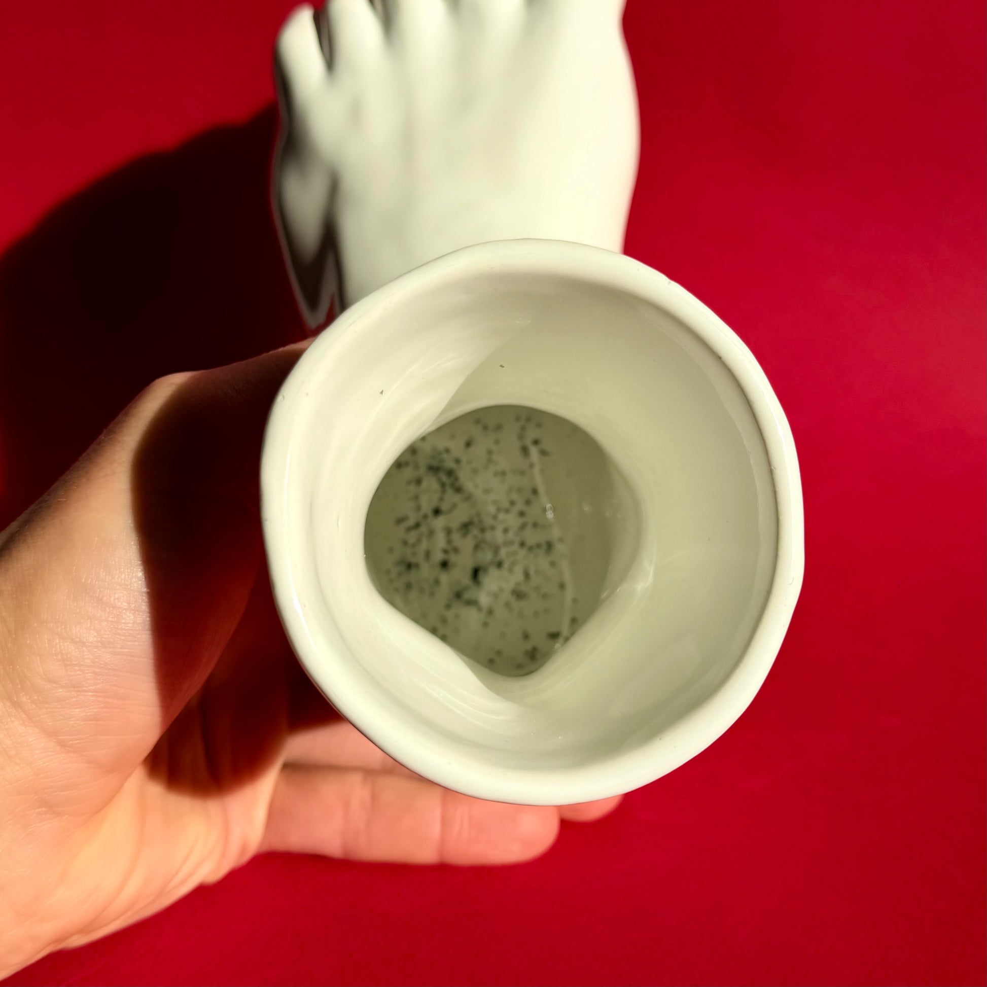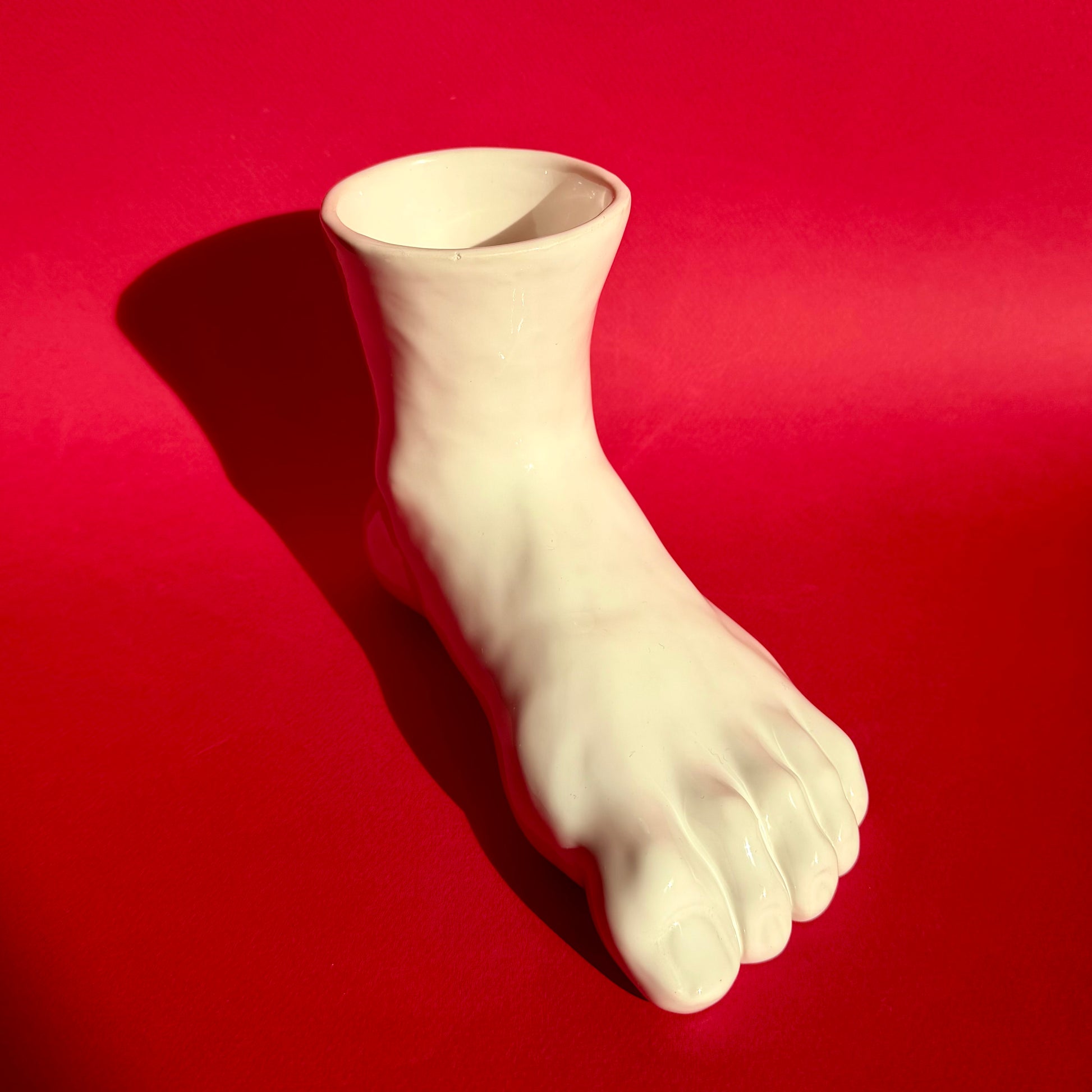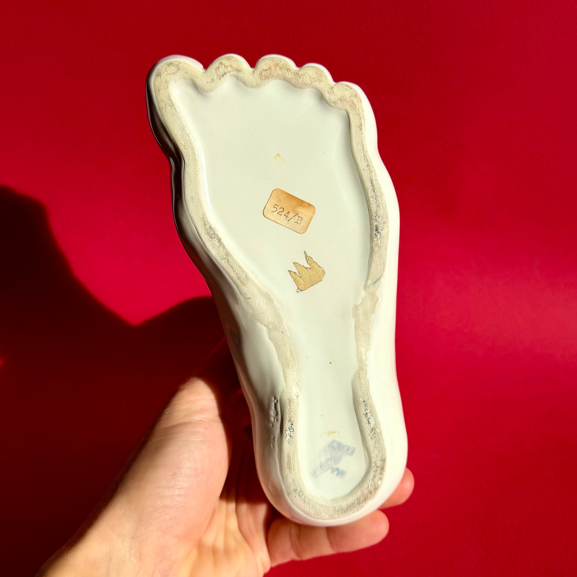 Features foot shaped vase / pencil holder in glossy white porcelain. Fornasetti / foot fetish vibes. Has some age appropriate wear with small chip to rim and pen marks on interior. Label on base, shows very well.