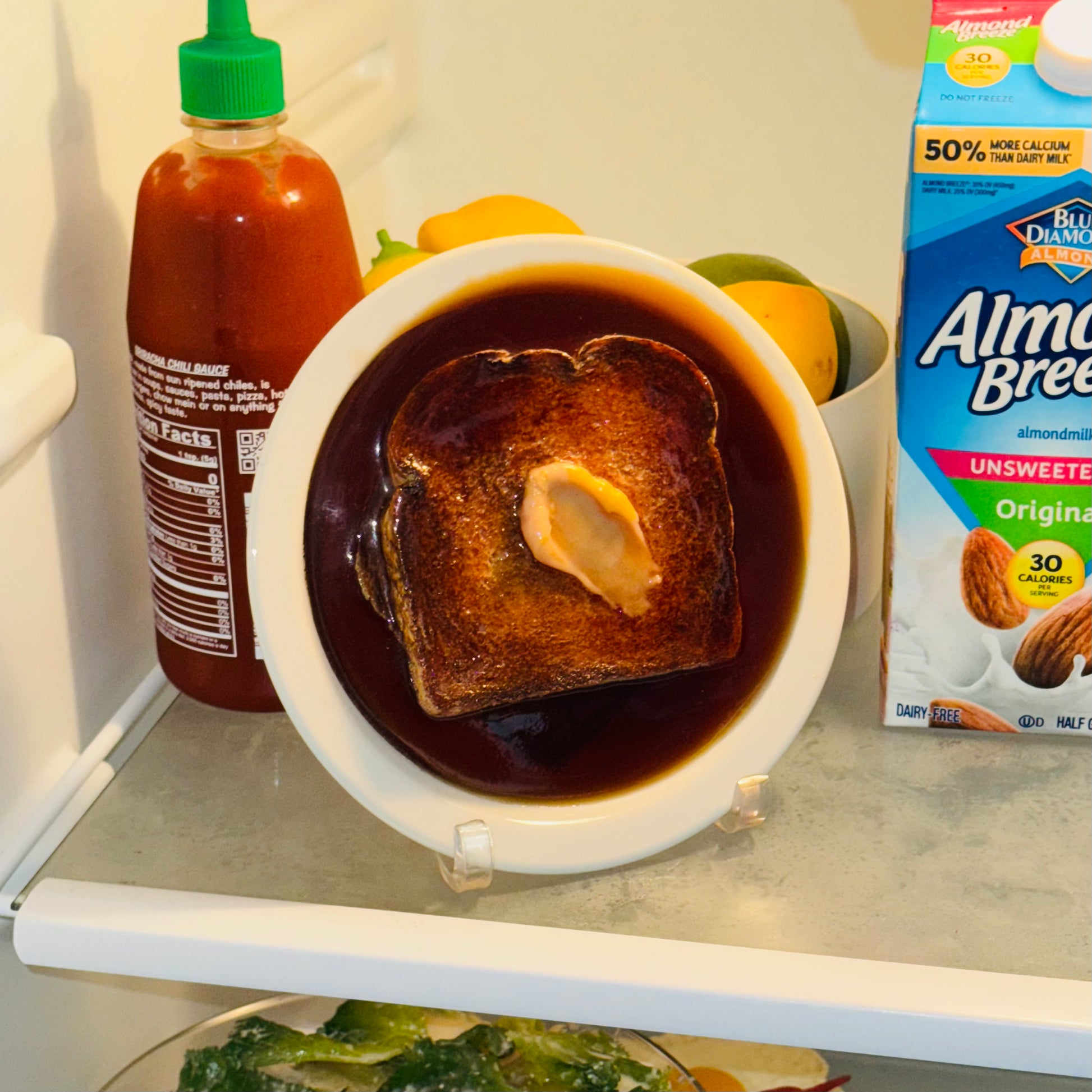 Features real bread on ceramic plate in so much resin syrup with resin butter smear. Too gooey so gross / amazing. Hang it on the wall for maximum effect. Shows minor age appropriate wear.