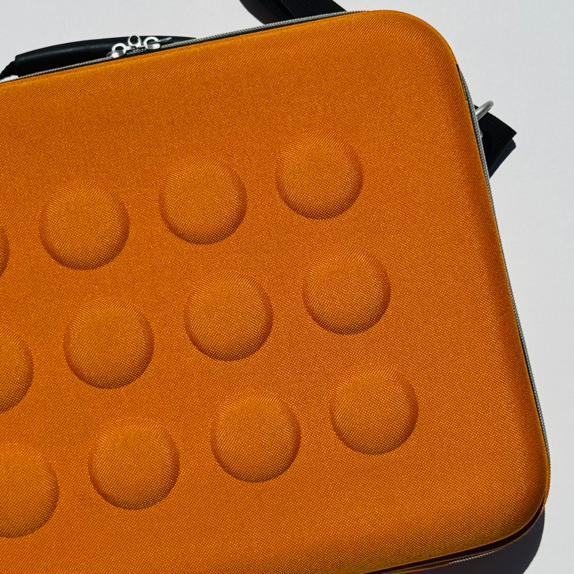 Features Marc Newson vibes in molded orange neoprene / nylon with circle detail. Zip closure with adjustable strap, exterior pocket, interior pockets and key ring. Suitable as a weekend bag, laptop bag etc. Has some minor age appropriate wear with some marks, Shows very well.