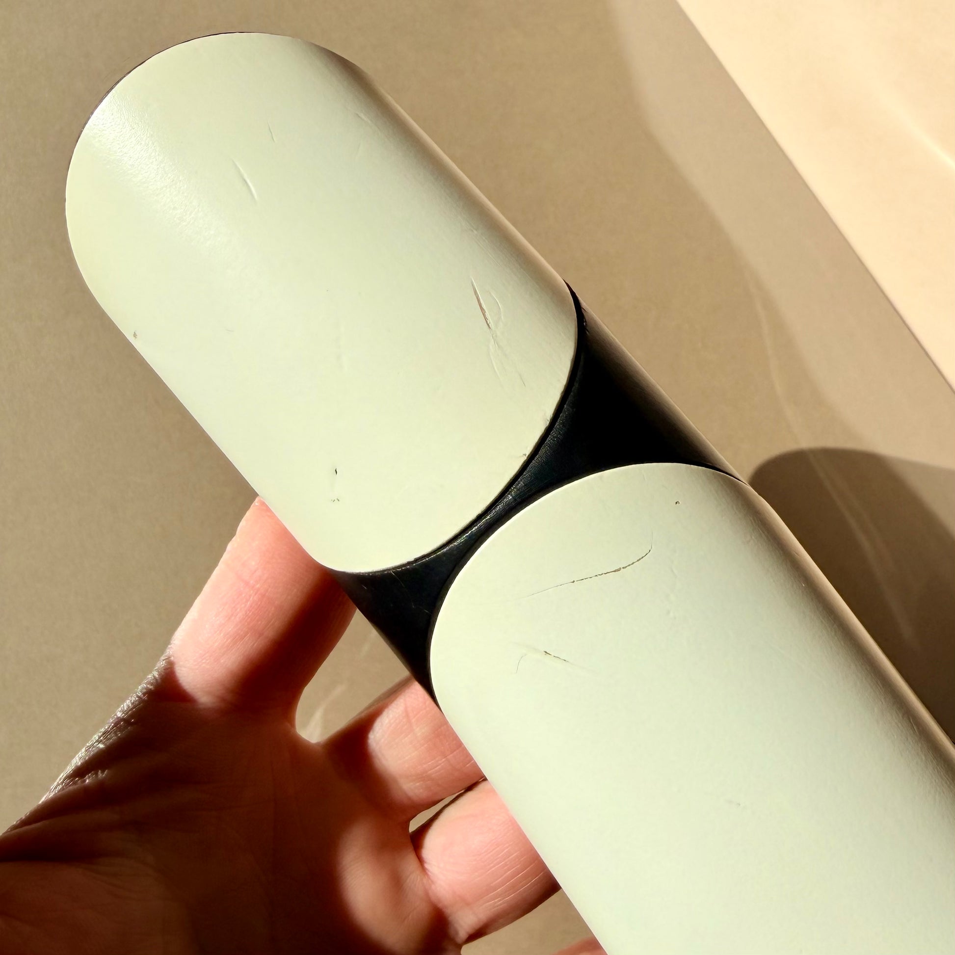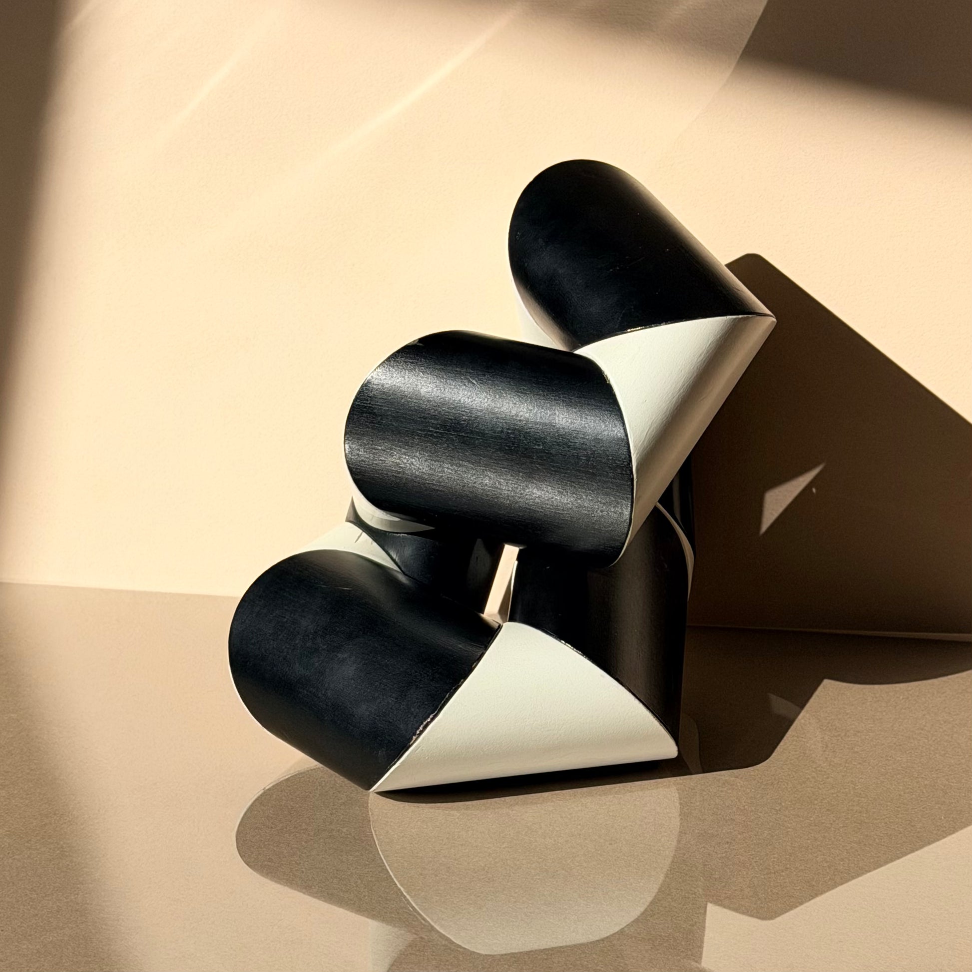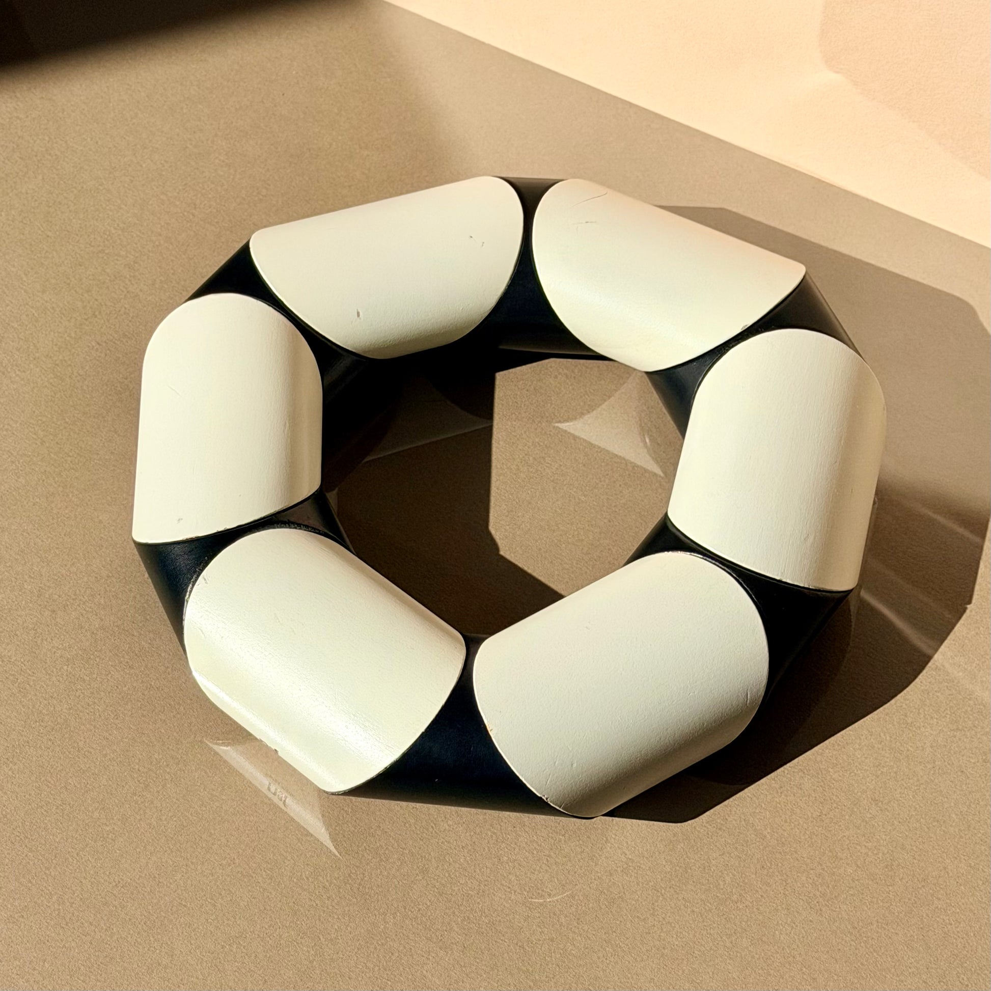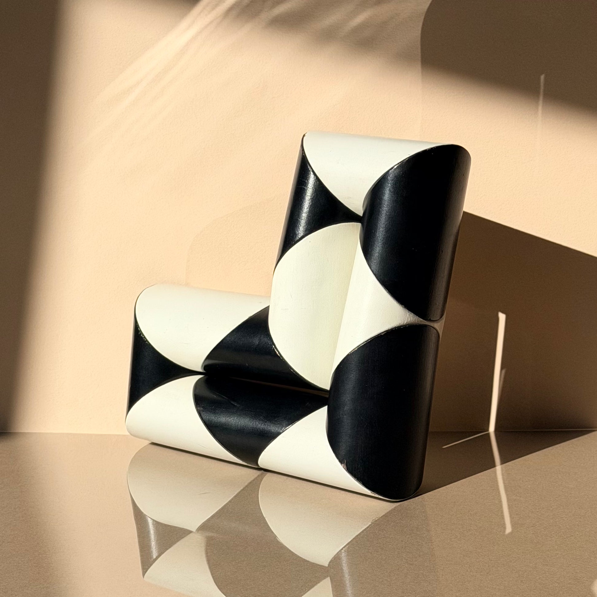 Black and white lacquered wooden elements with 12 rotating joints are the basic aspects of this unique and changing elliptical optical shape, which should be experienced with both hands. Transforms into multiple shapes with slight adjustment. Shows some age appropriate scratches and scuffs. Pretty fantastic overall.